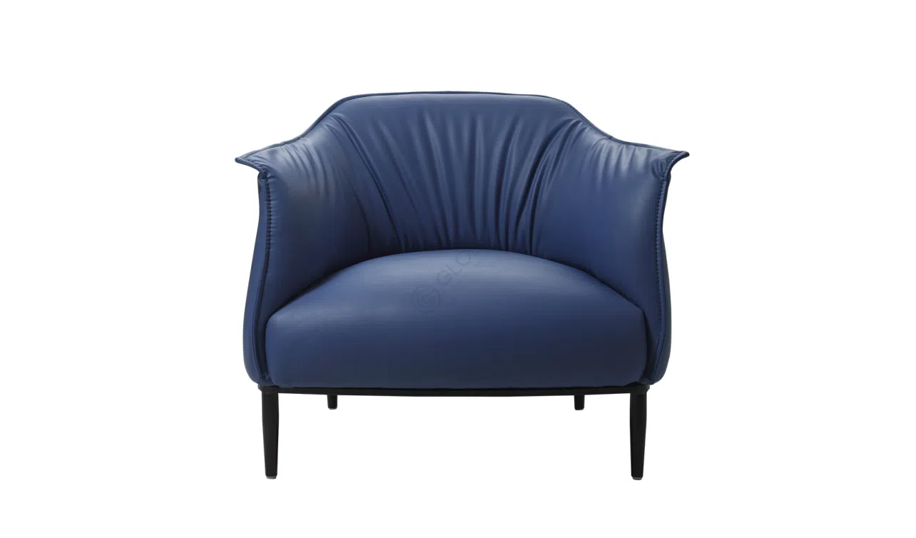 Этот предмет мебели демонстрирует изысканность современного дизайна. Его изогнутые формы создают ощущение обволакивающего комфорта и элегантности. Глубокий синий оттенок обивки привлекает внимание, делая кресло выразительным акцентом в пространстве. Особенность его внешнего вида проявляется в объемной драпировке спинки, которая придает уникальную текстуру и характер.