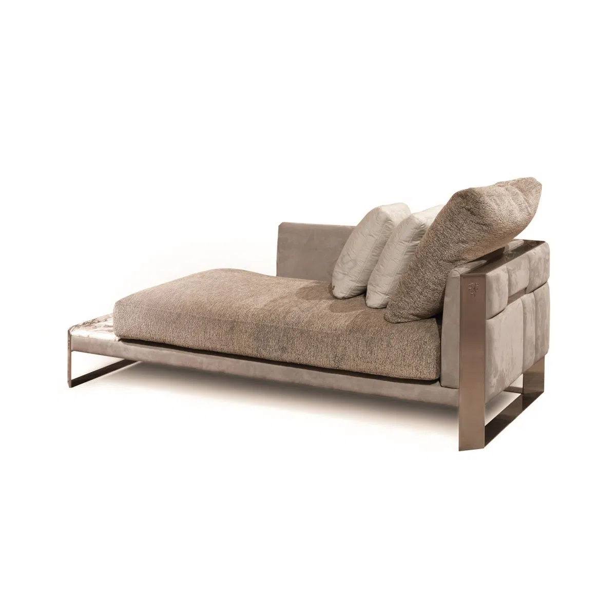 Высококачественные материалы подчеркивают премиальный статус изделия. Блеск металлической отделки гармонично сочетается с мягкостью экокожи на микрофибровой основе, которая покрывает основные поверхности, включая фасады ящиков и боковые панели с интересным рельефом. Использование МДФ и текстиля в конструкции гарантирует долговечность и комфорт при каждом прикосновении.
