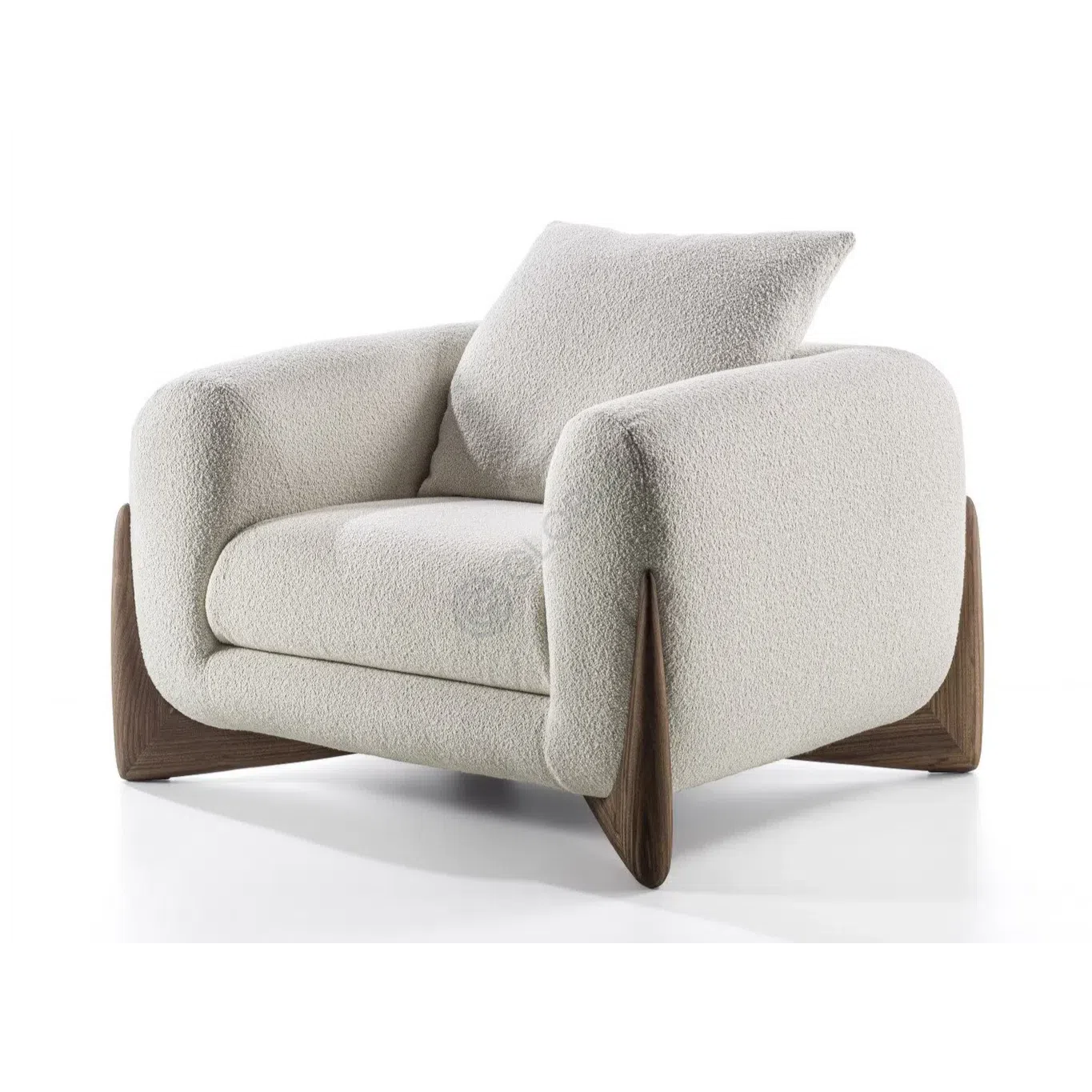Воздушная и тактильно приятная текстильная обивка приглашает прикоснуться и ощутить ее мягкость. Она изящно контрастирует с основанием из натурального дерева, чьи теплые оттенки и изогнутая форма подчеркивают уникальный характер изделия. Прочный каркас из фанеры, скрытый внутри, обеспечивает надежность и долговечность конструкции.