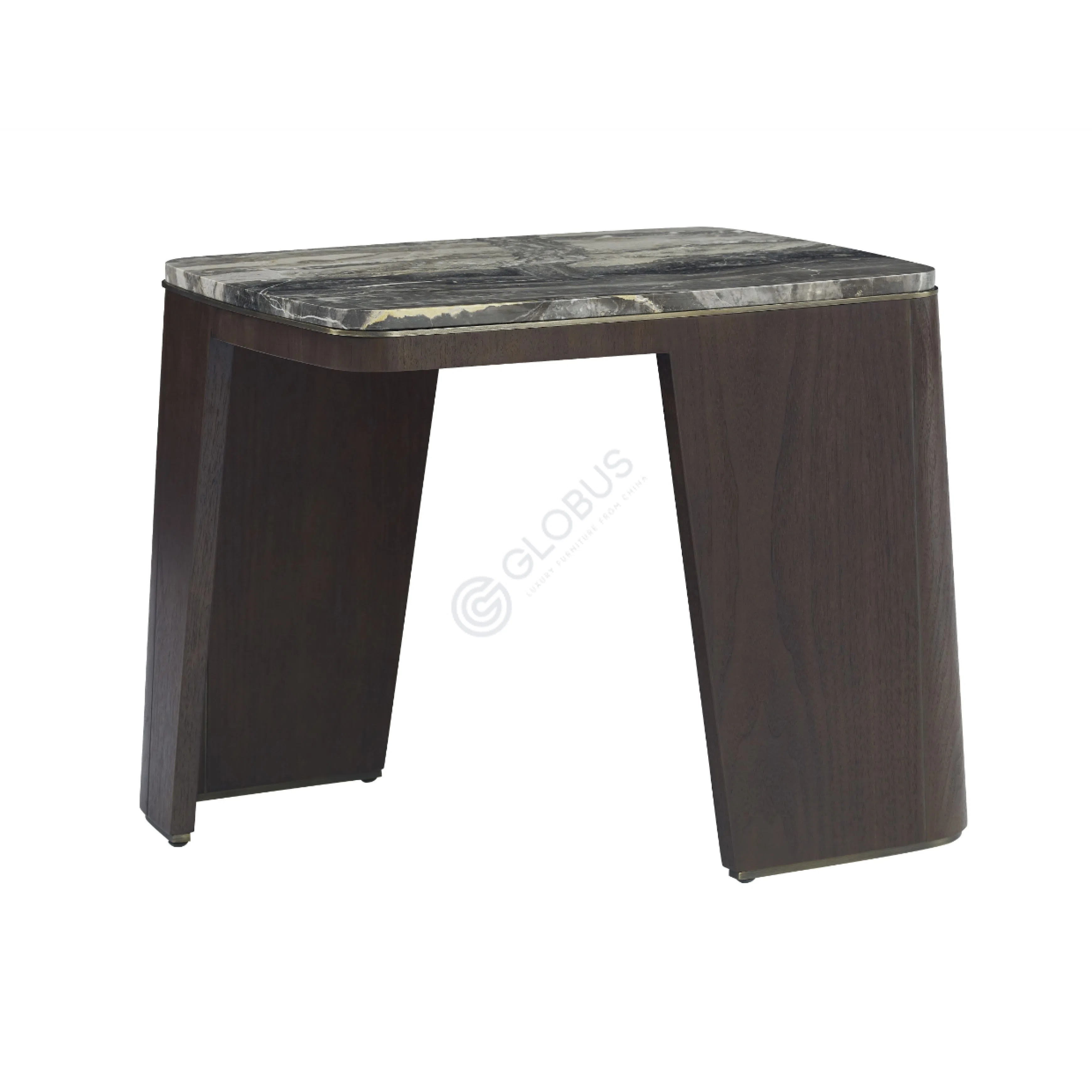 Силуэт столика отличается выразительной асимметрией: одна сторона покоится на сплошной опоре, тогда как другая формирует изящный проем, наделяя всю конструкцию визуальной легкостью. Эта продуманная форма не только обеспечивает устойчивость, но и добавляет изделию характер, позволяя ему элегантно заполнять пространство.
