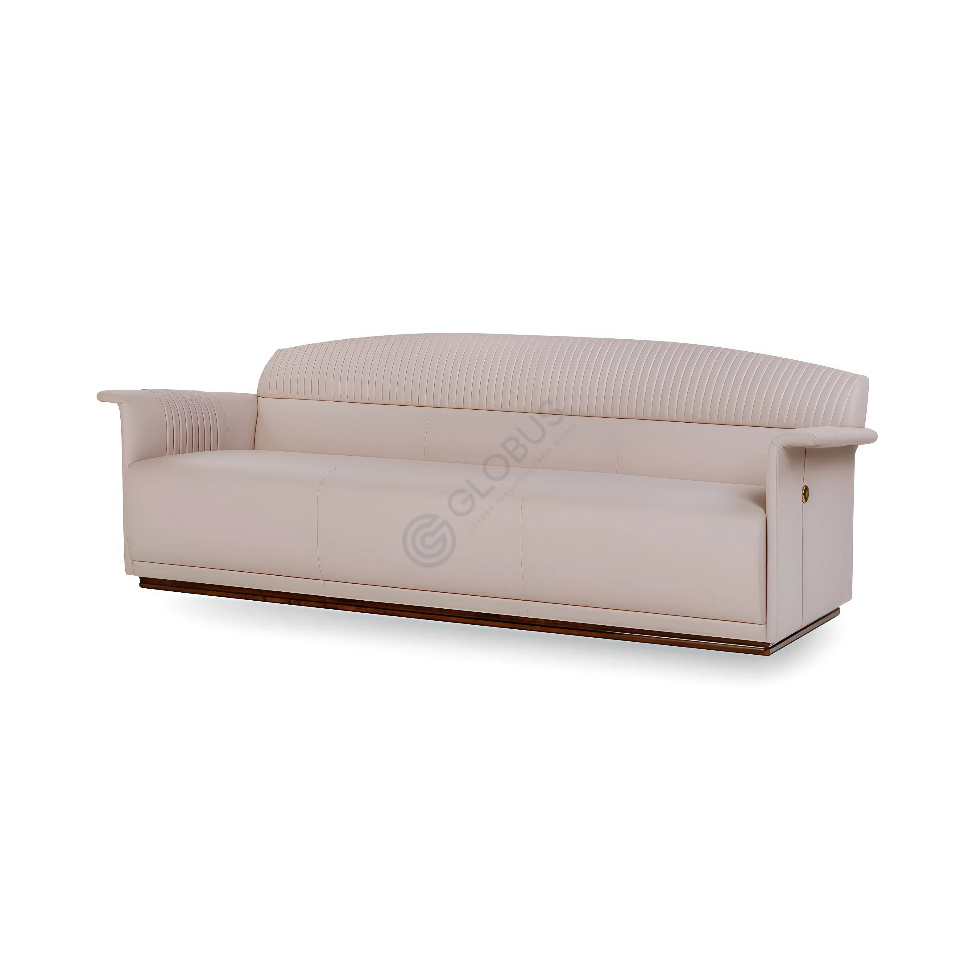 Основа конструкции выполнена из натурального дерева и фанеры, что гарантирует прочность и долговечность изделия. Обивка из высококачественной экокожи на микрофибре обладает приятной на ощупь текстурой, сочетая в себе практичность и изысканность. Этот материал отличается высокой износостойкостью, придавая креслу благородный вид. Внимание к деталям проявляется в изящных вертикальных акцентах на внешней стороне подлокотников, добавляющих модели особый шарм.