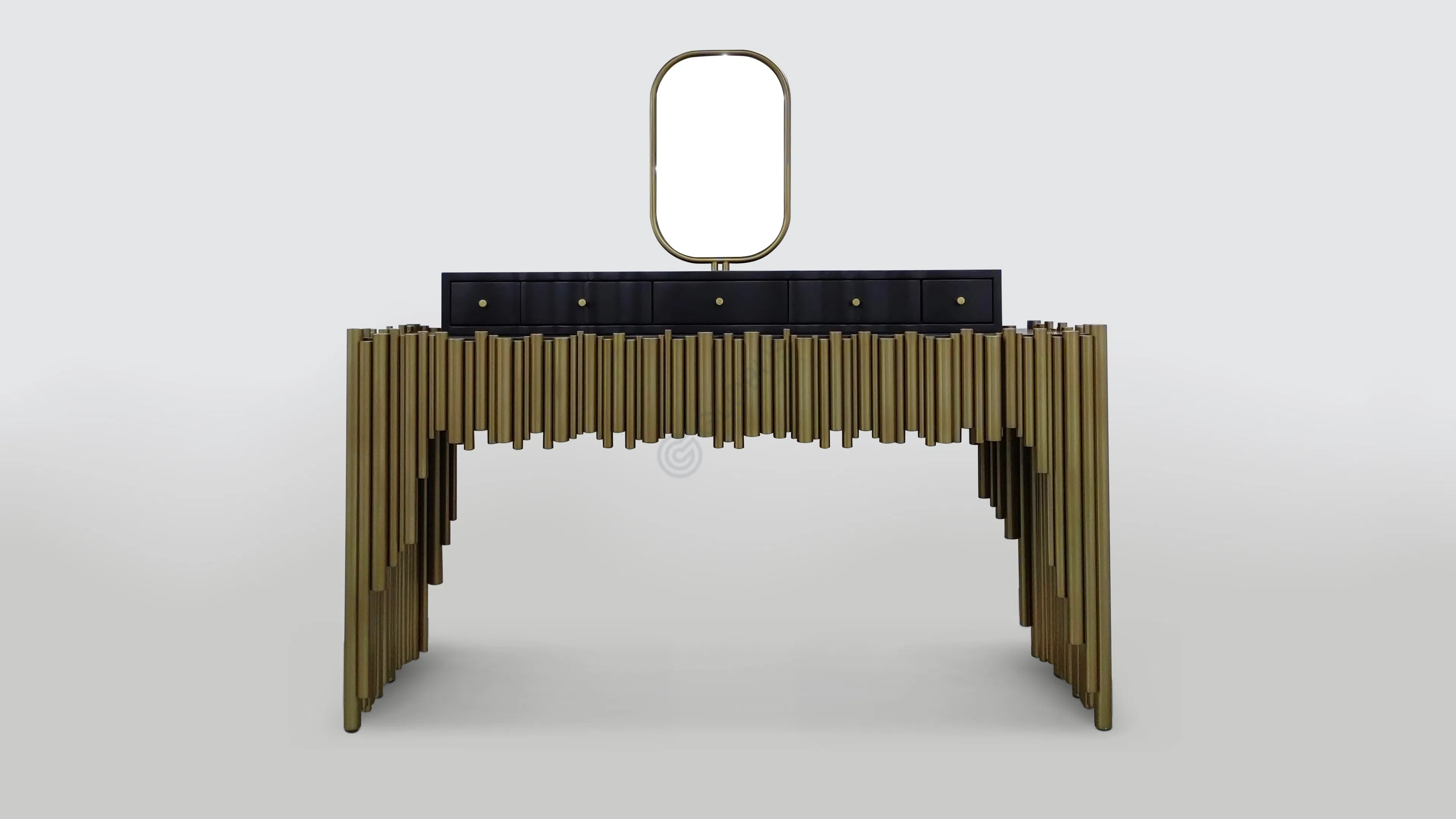 Буфет в духе ар-деко с графичным фасадом из вертикальных трубок из полированной нержавеющей стали с мягким золотистым оттенком. Чёткий ритм линий образует скульптурный силуэт, который поддерживает лаконичный тёмный цоколь.