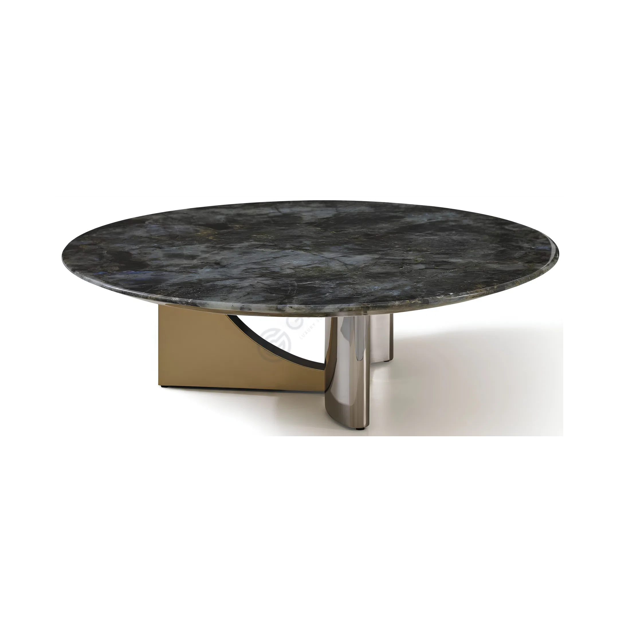 Круглая столешница из природного мрамора с нежно-серыми и графитовыми прожилками гармонирует с основанием. Опора сочетает изящные стальные пластины с мягким золотистым отливом и массивный блок из того же минерала, выполненный в строгой геометрии. Такие элементы создают плавный переход между природной текстурой и индустриальной эстетикой.