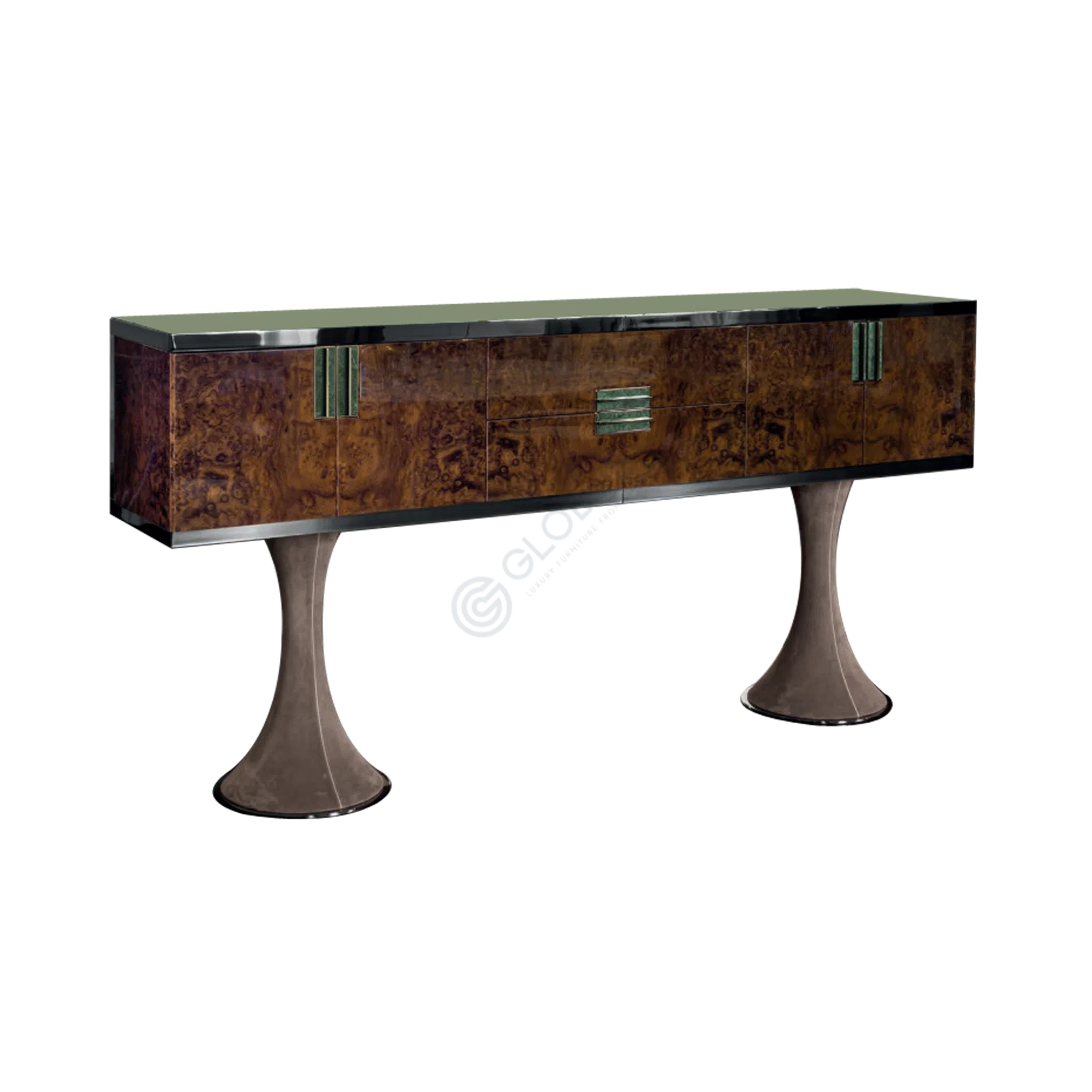Изысканность достигается благодаря тщательно подобранным материалам. Конструкция выполнена из прочной фанеры и полированной нержавеющей стали. Стенки из закаленного стекла обеспечивают обзор внутреннего содержимого, добавляя воздушности и света. Основание и некоторые детали обтянуты экокожей на микрофибре, что придает поверхности приятную тактильность и роскошный вид. В его облике переплетаются чистые линии современного дизайна и декоративная выразительность, характерная для стиля Ар-деко.