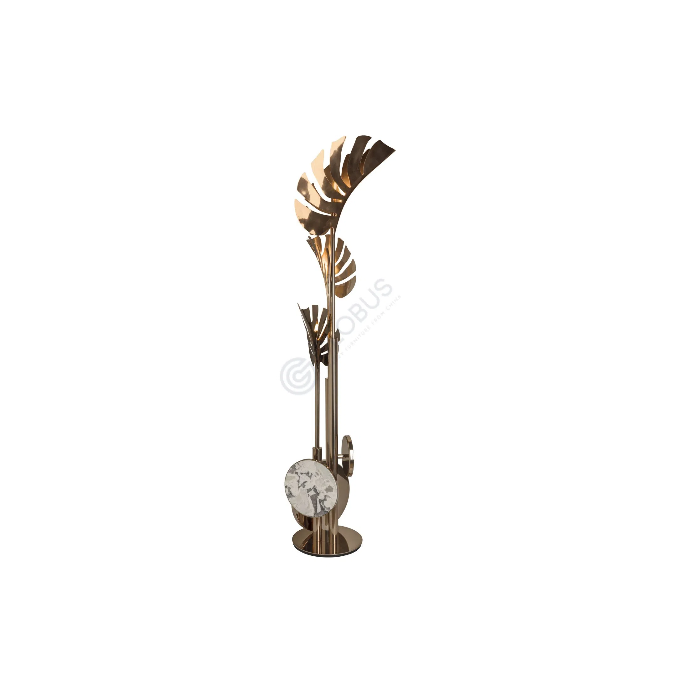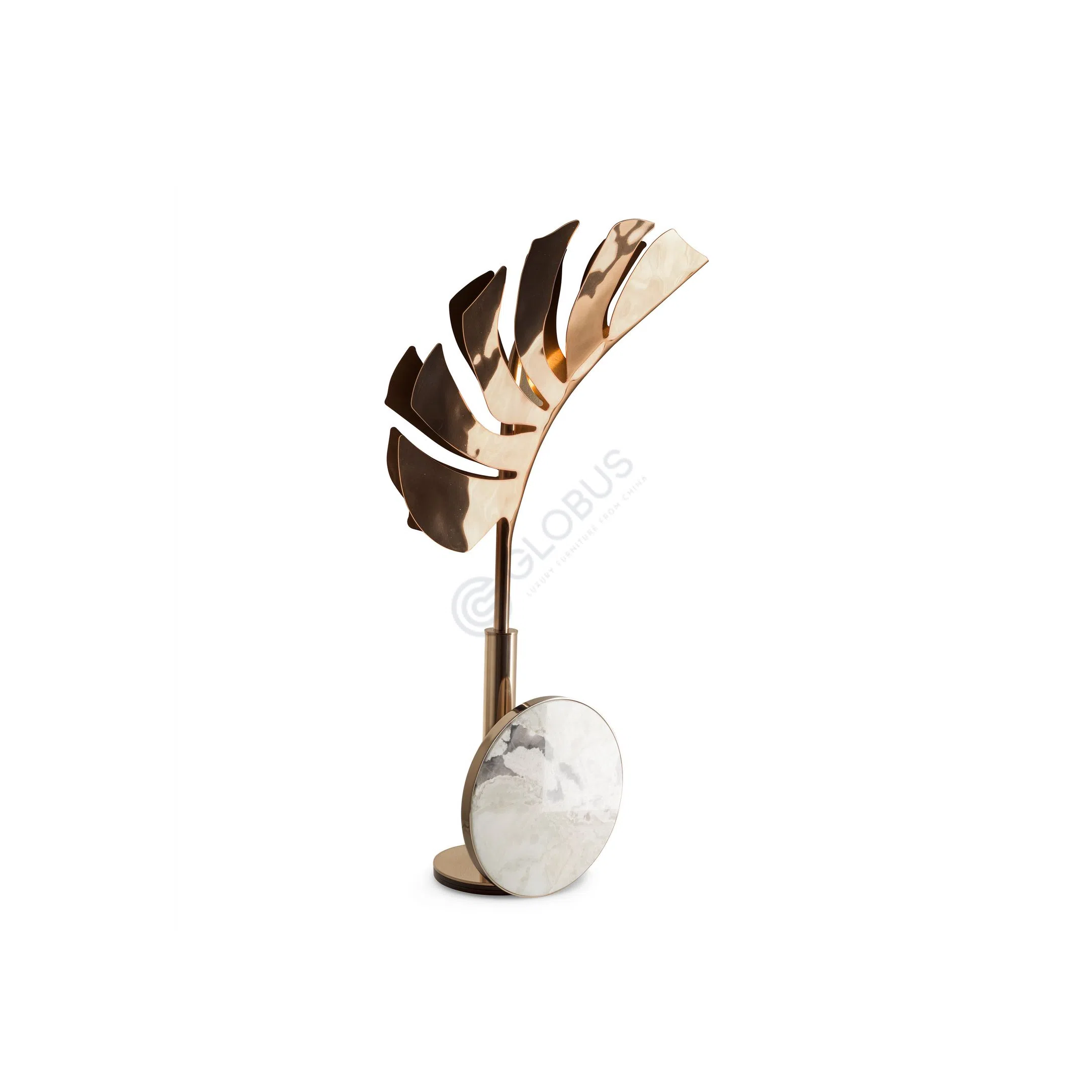 Настенный светильник представляет собой изящное сочетание природных мотивов и современного мастерства. Его верхняя часть выполнена из нержавеющей стали, тонко изогнутой в форме ажурного листа, что придает силуэту легкость и динамику. У основания располагается диск из природного камня, каждый с уникальным, неповторимым узором, добавляющим изделию эксклюзивности.