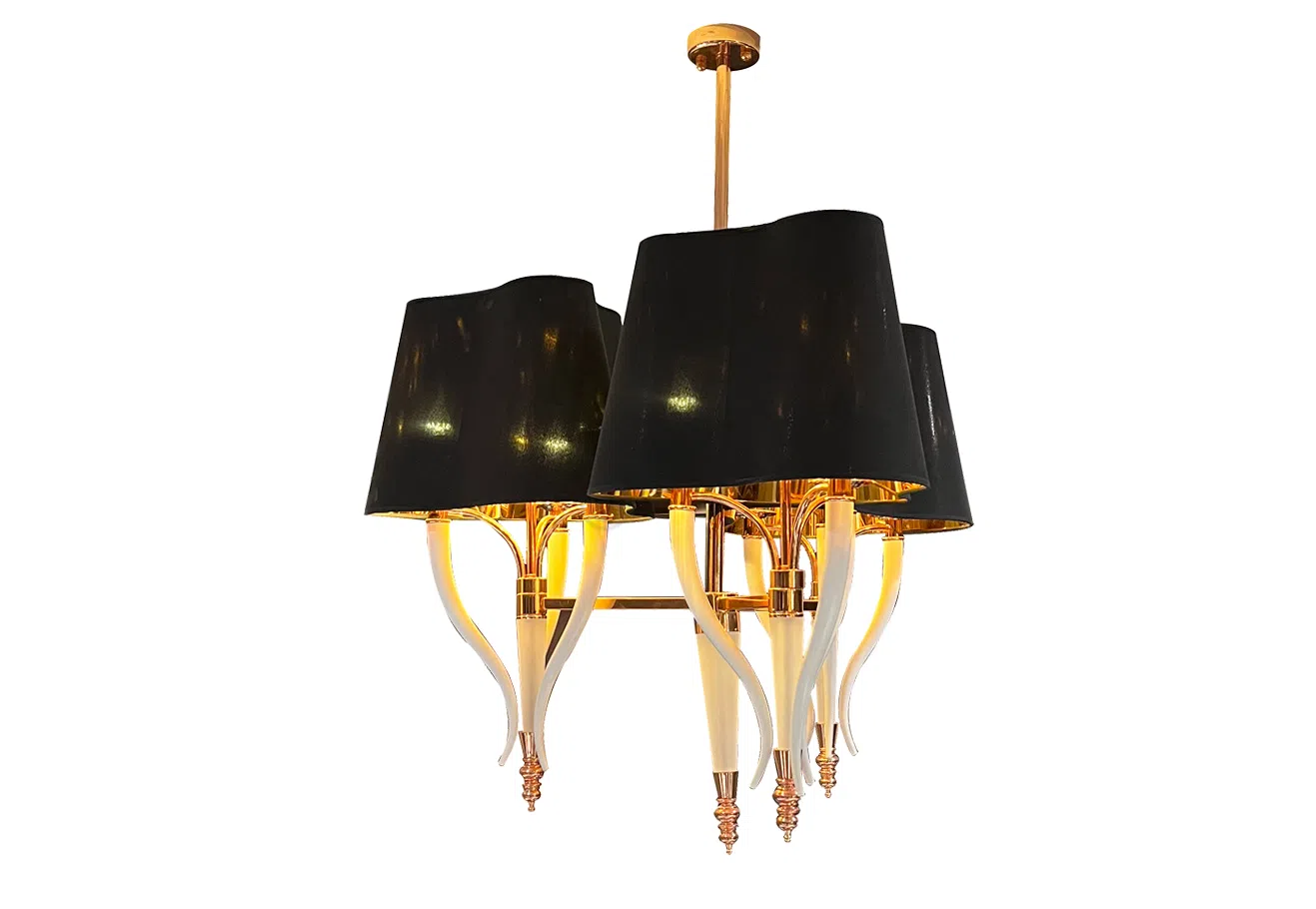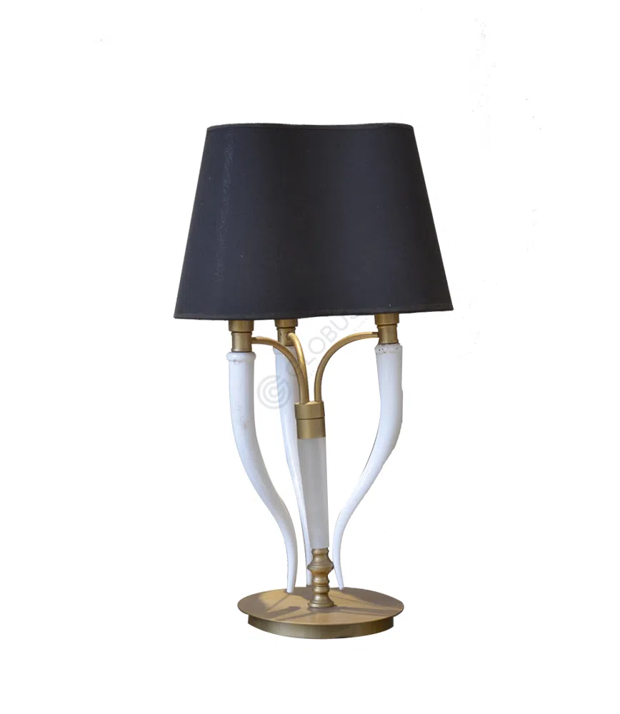 Основание выполнено из благородного металла с изящным золотистым оттенком, который придает изделию роскошный вид. Стойка плавно переходит в декоративные элементы, сочетающие металл с вставками светлого цвета, создавая гармоничный контраст и подчеркивая утонченность формы. Круглое основание обеспечивает устойчивость и завершает композицию.