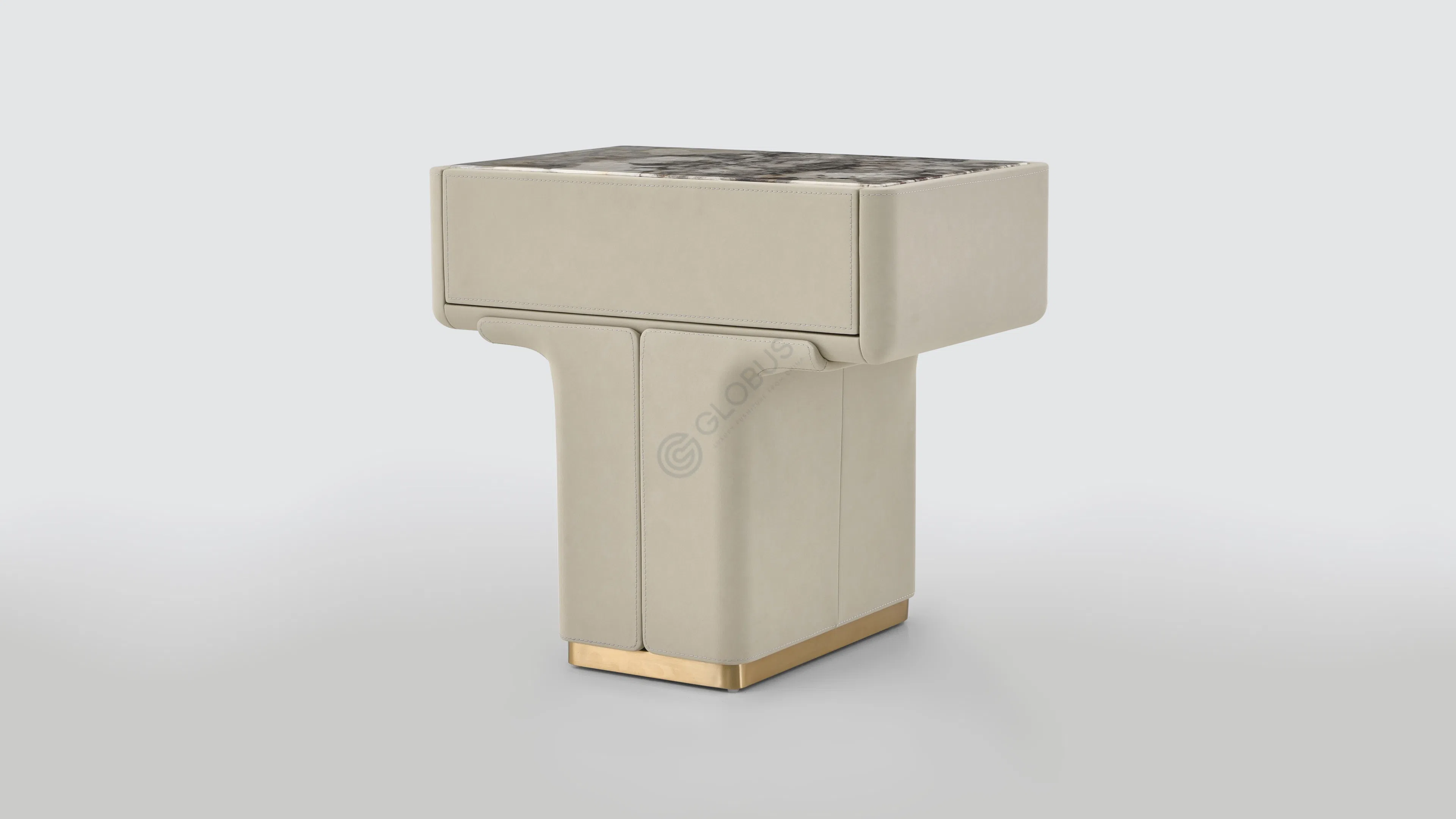 Буфет в современном стиле сочетает в себе геометричность форм и лаконичный дизайн, что делает его гармоничным решением для столовой, кухни или гостиной. Корпус выполнен из МДФ с аккуратной отделкой экокожей приятного светло-серого оттенка, а основание из нержавеющей стали с матовым золотистым акцентом подчёркивает благородство изделия.