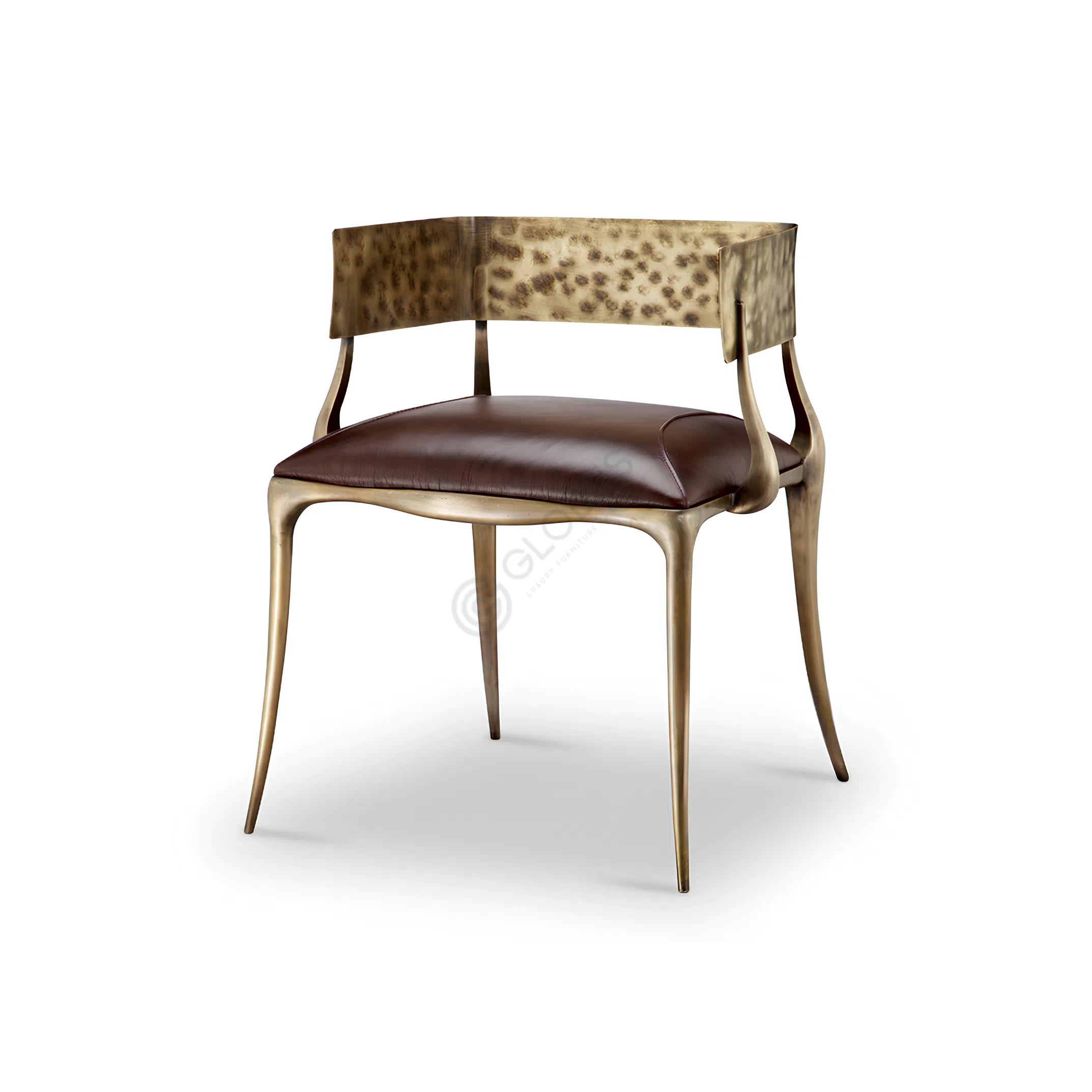 Скульптурный буфет, где современный характер встречается с ар-деко, выделяется плавным медным обводом и темным, строгим объемом. Высокие опоры придают легкость, а мягкий металлический блеск создает уверенный акцент в интерьере.