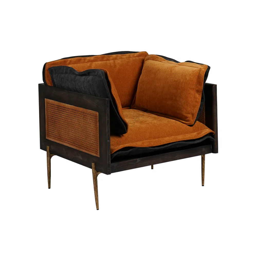 Диван сочетает в себе аутентичные материалы и выразительный дизайн, подчеркивая атмосферу современной гостиной. Текстиль глубокого оттенка терракоты создает ощущение уюта, а объемные подушки обеспечивают особое удобство.
