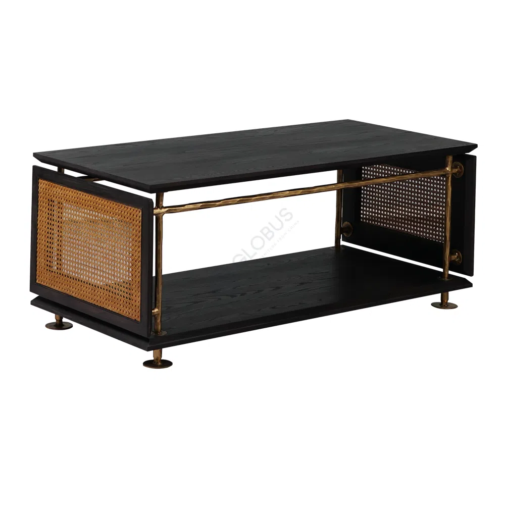 Основа столика выполнена из фанеры и шпона, обработанных до глубокого темного оттенка, который придает изделию благородство и визуальную прочность. Контрастными элементами выступают панели из натурального ротанга с характерным плетением, добавляющие поверхности легкость, тепло и тактильную привлекательность. Детали из железа, служащие опорными элементами и декоративными акцентами, привносят в конструкцию изысканную строгость и промышленную элегантность.