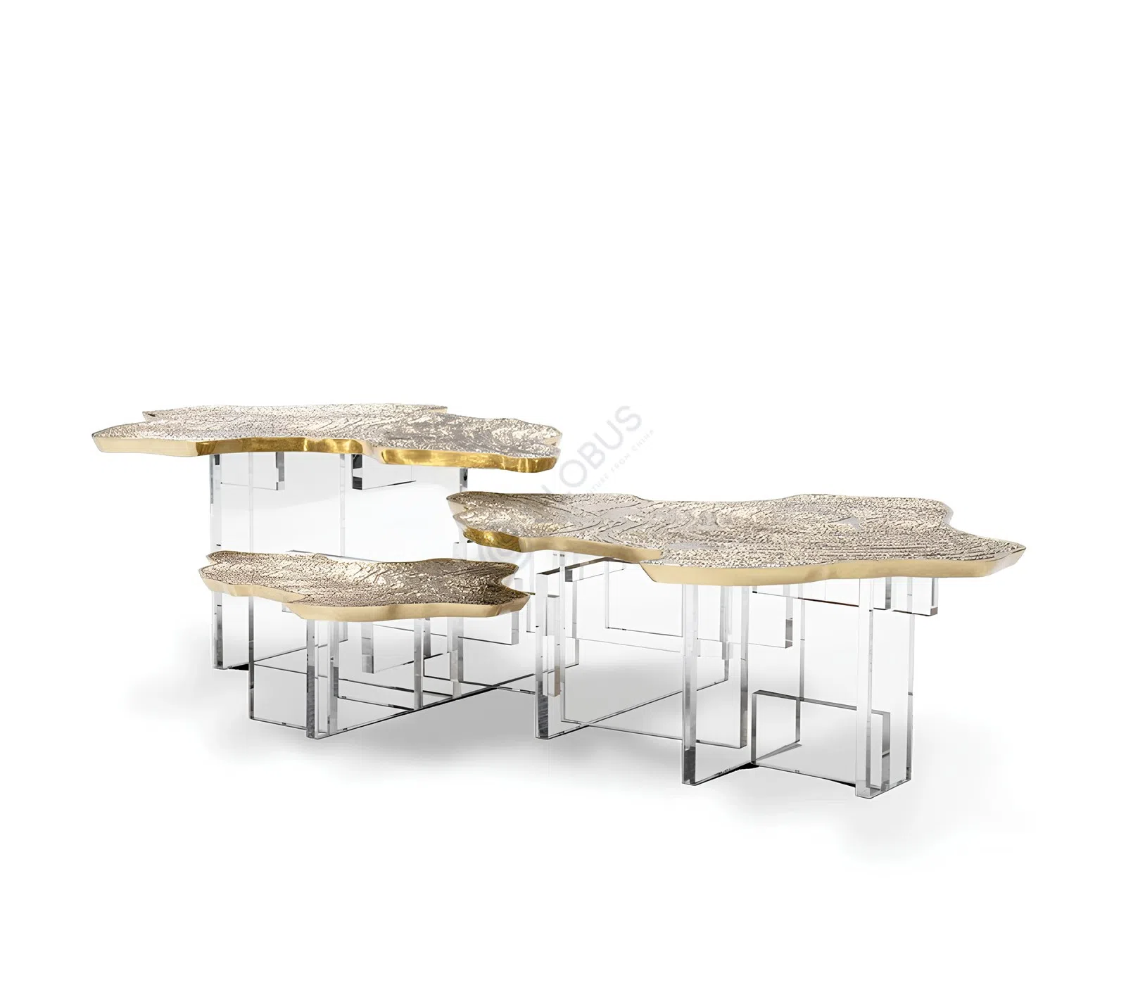 Основание столика выполнено из прозрачного акрила, который придает ему визуальную невесомость и позволяет свету играть в гранях. В контраст к этому, верхняя часть изготовлена из латуни с выразительной фактурной поверхностью. Соединение кристальной чистоты акрила и теплого металлического блеска латуни создает неповторимый образ, характерный для премиального дизайна.