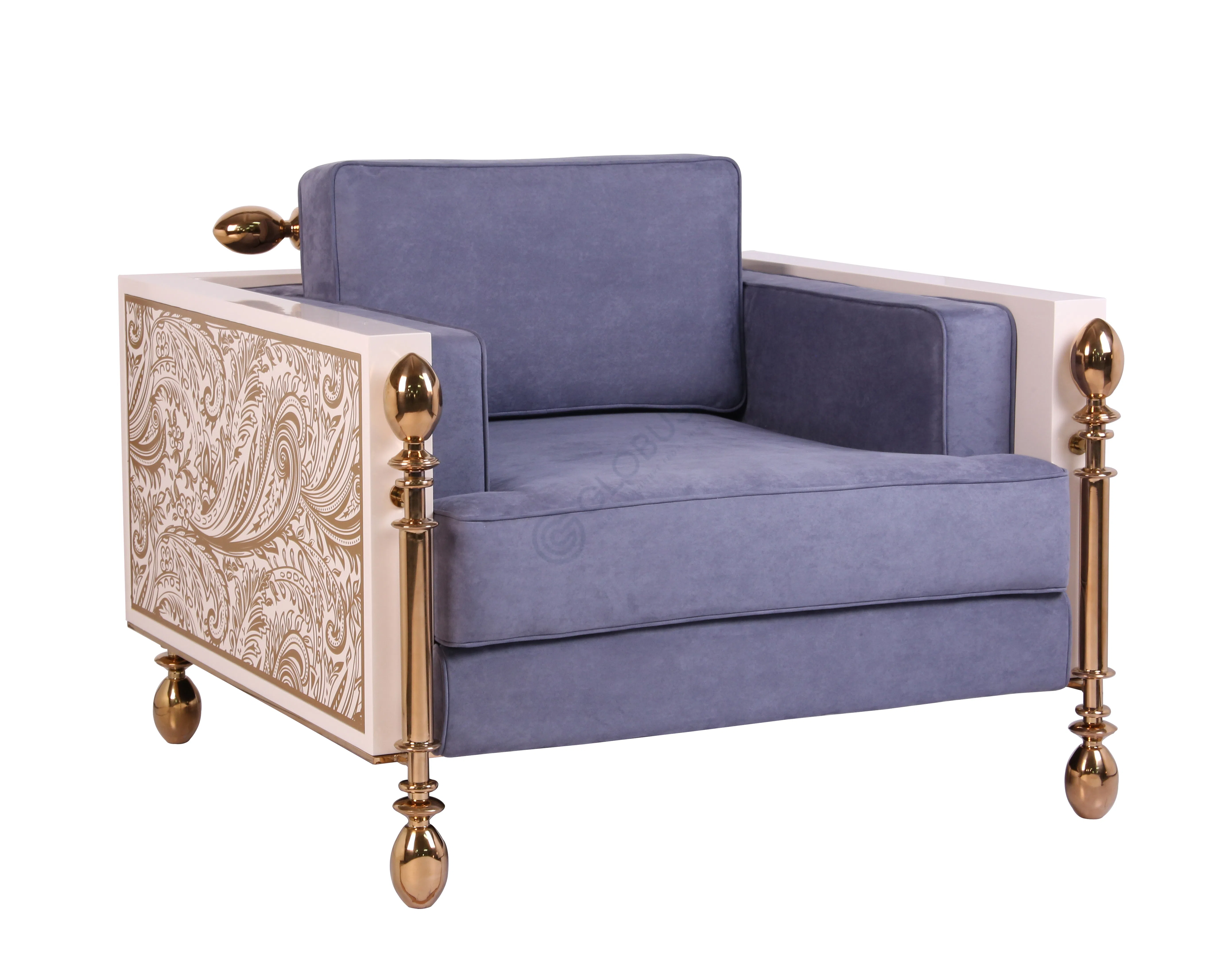 Особое внимание привлекают акценты из полированной нержавеющей стали с благородным золотистым покрытием, подчеркивающие геометрическую четкость форм и добавляющие блеск. Уникальный подлокотник украшен тонким резным или рельефным узором, придавая дивану индивидуальность и шарм. Декоративные опоры служат изящным завершением образа.
