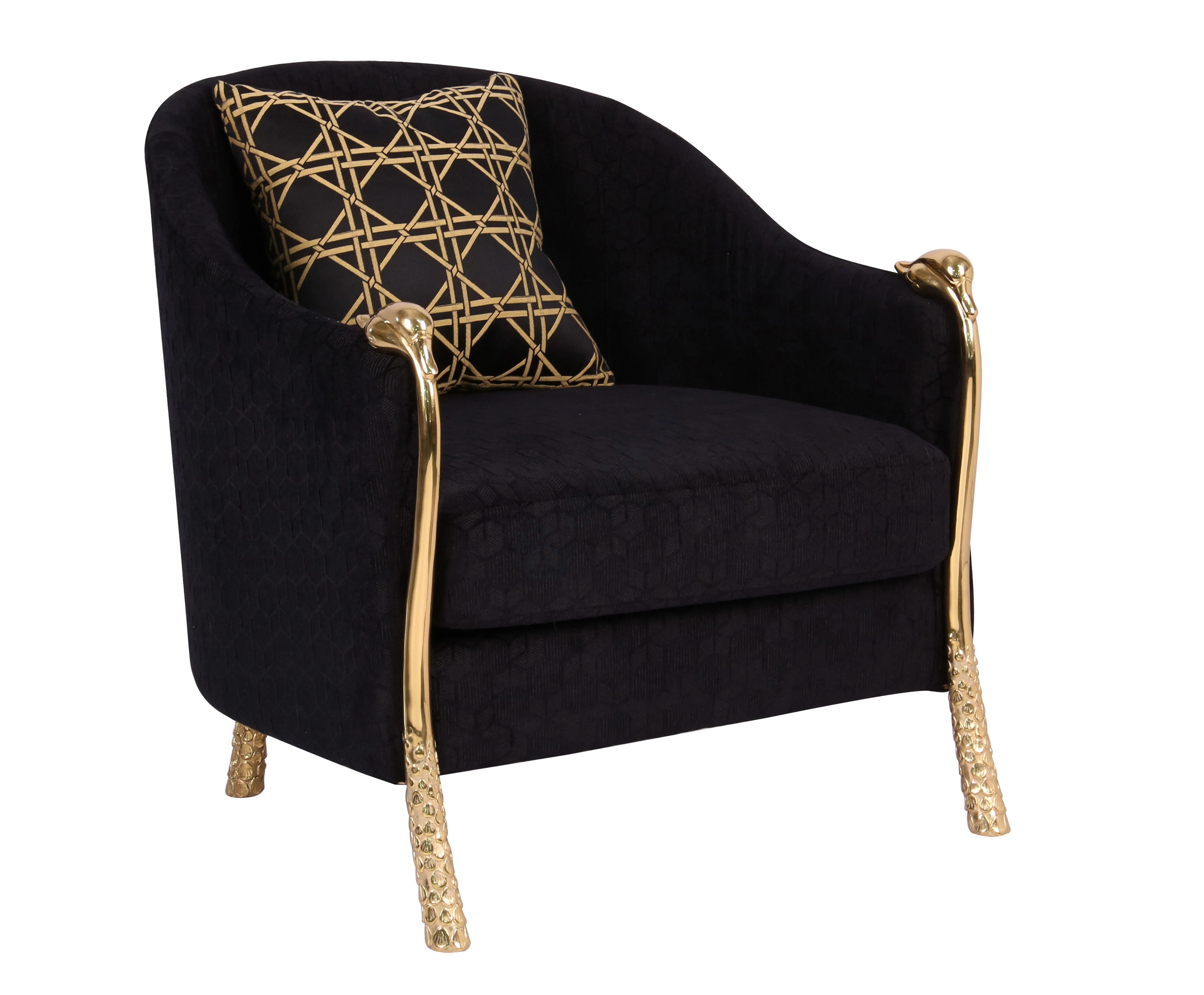 Обивка выполнена из благородного текстиля глубокого оттенка, который нежно переливается под светом, приглашая к комфортному отдыху. Внимание привлекают оригинальные опоры: каждая ножка – это настоящее произведение искусства, отлитое из сияющей латуни и украшенное фактурным декором, добавляющим утонченный акцент.