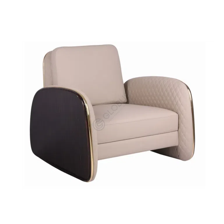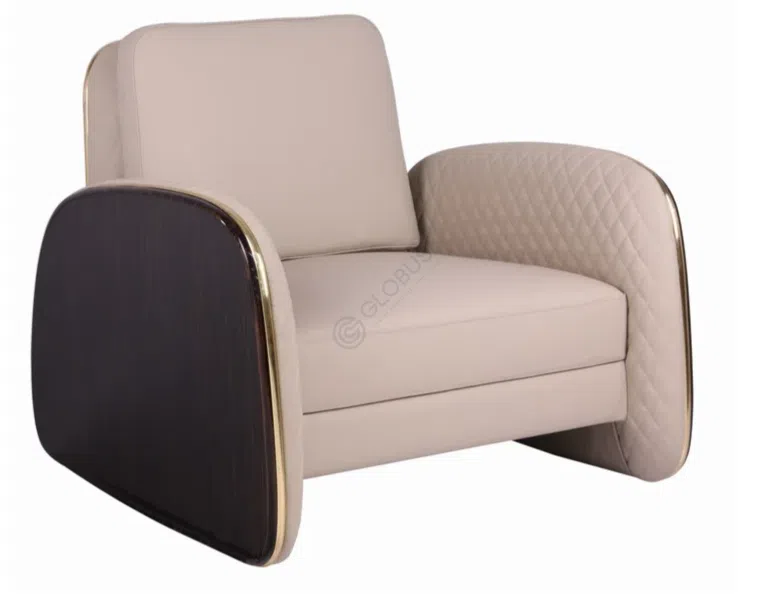 Материалы, используемые в отделке, подчеркивают роскошный характер изделия. Основание и боковины декорированы натуральным деревом с изящным шпоном, добавляющим теплоты текстуре. Один из подлокотников эффектно акцентирован вставкой из полированной латуни, сияющей благородным блеском. Другая сторона имеет оригинальное стеганое исполнение, создающее тонкий узор.