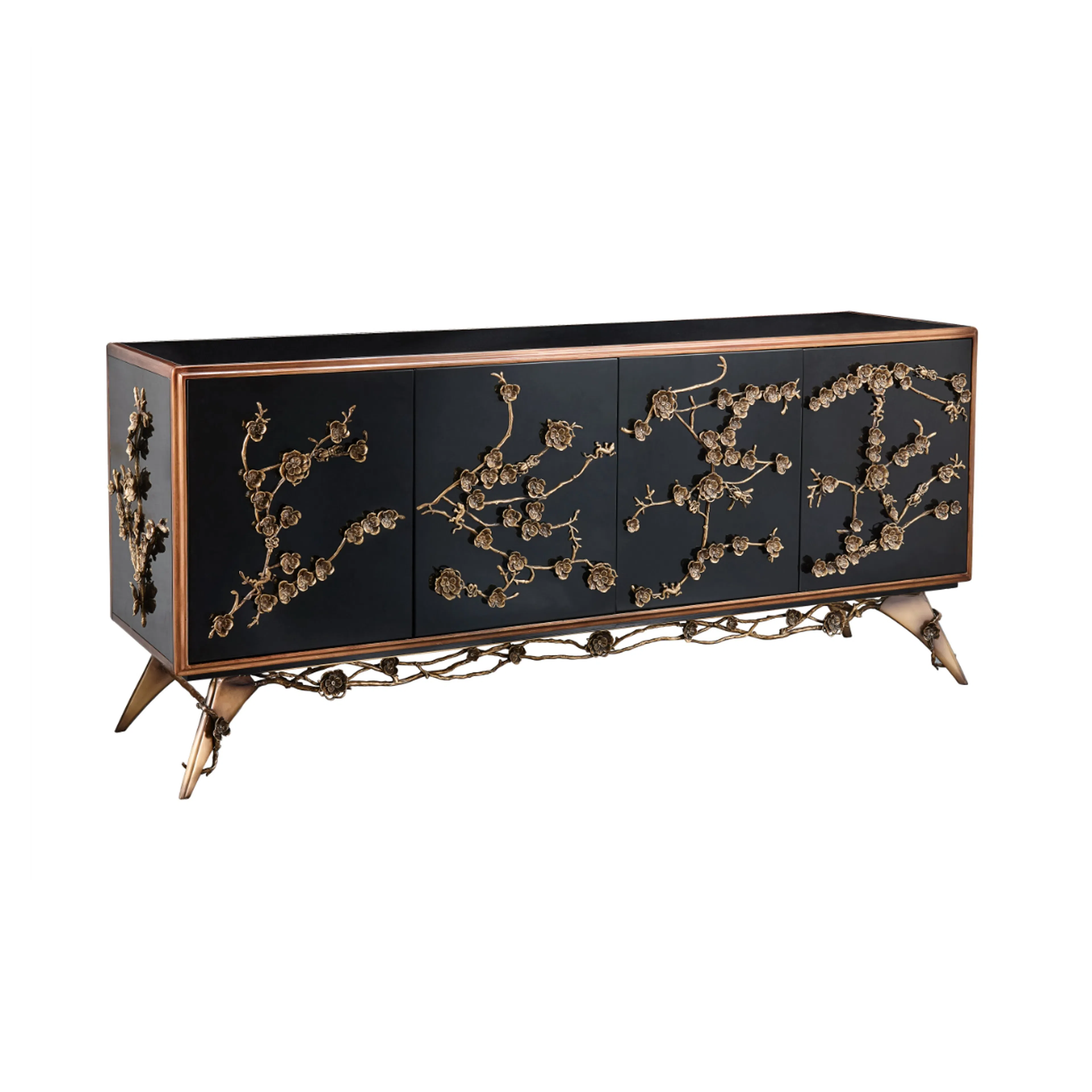 Основу конструкции составляет прочный МДФ, обеспечивающий долговечность и надежность изделия. Особое внимание уделено деталям: фасад ящиков и изящное основание украшены накладками из благородной латуни. Цветочный орнамент, выполненный с высоким мастерством, придает тумбе неповторимый шарм и ощущение ручной работы. Металлические элементы создают эффектный контраст с темной глянцевой поверхностью.