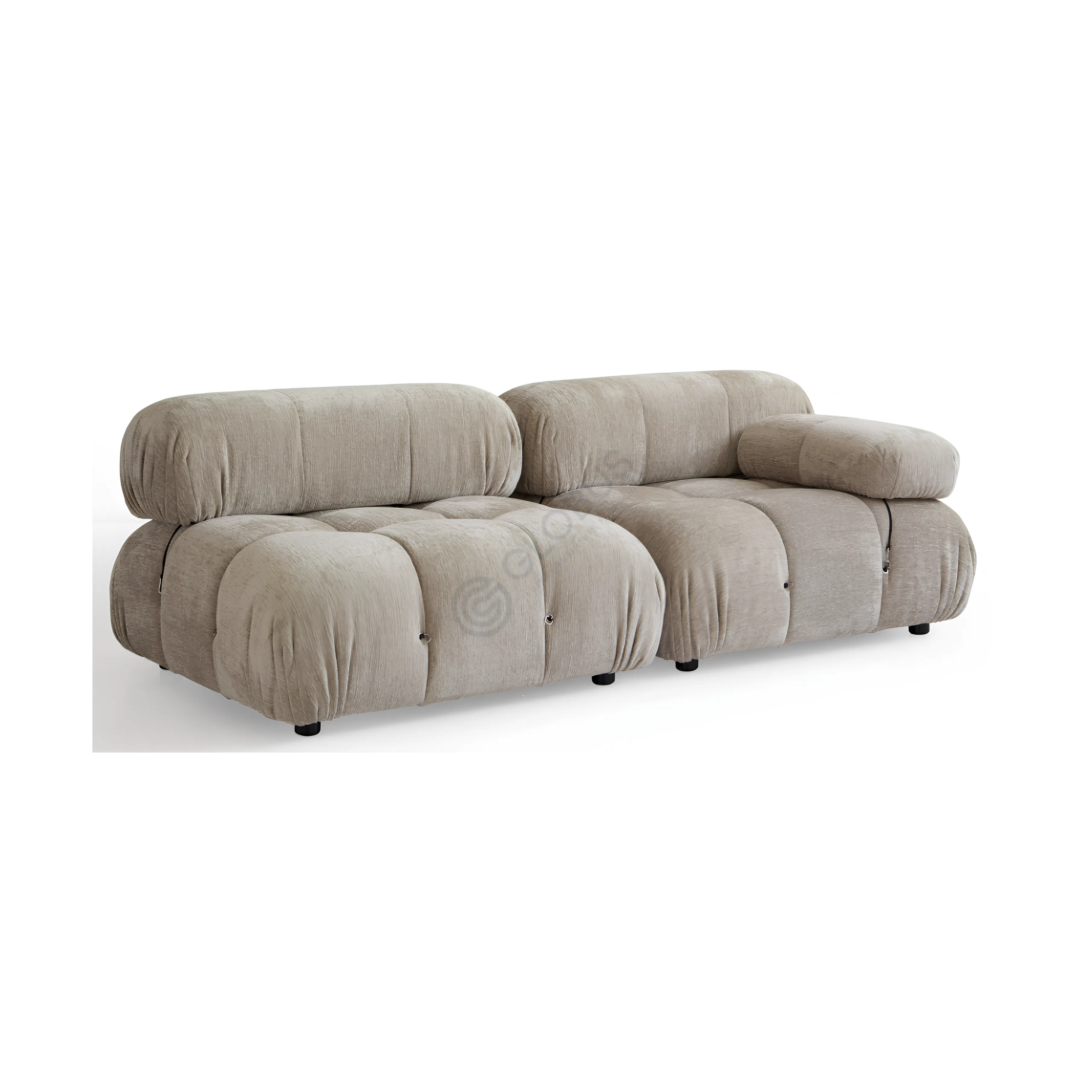 Внимание к деталям проявляется в исполнении глубокой стежки капитоне, которая формирует пышные рельефные секции. Каждая утяжка акцентирована лаконичной пуговицей, что добавляет дизайну завершенность и элегантность. Основание, задрапированное мягкими складками, скрывает прочный каркас из фанеры и создает ощущение визуальной легкости.