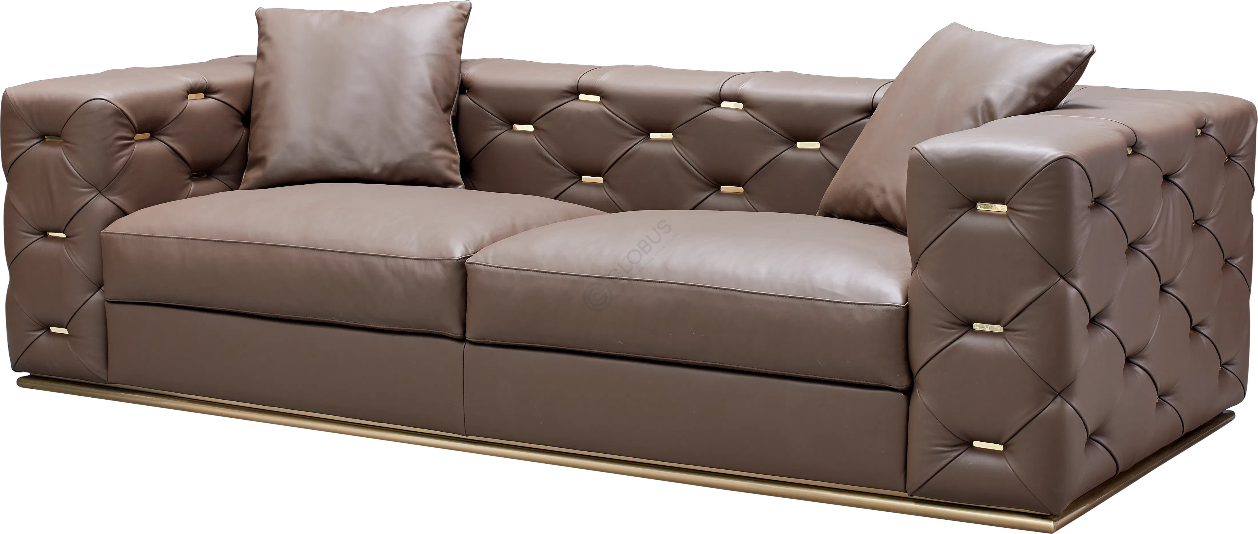 Обивка выполнена из благородного текстиля, который придает поверхности особый визуальный и тактильный эффект. Внимание привлекает роскошная стежка по боковинам и спинке, формирующая ромбовидный узор. В каждую точку пересечения стежки искусно интегрирован декоративный элемент из нержавеющей стали с золотистым оттенком, добавляющий изделию утонченного блеска.