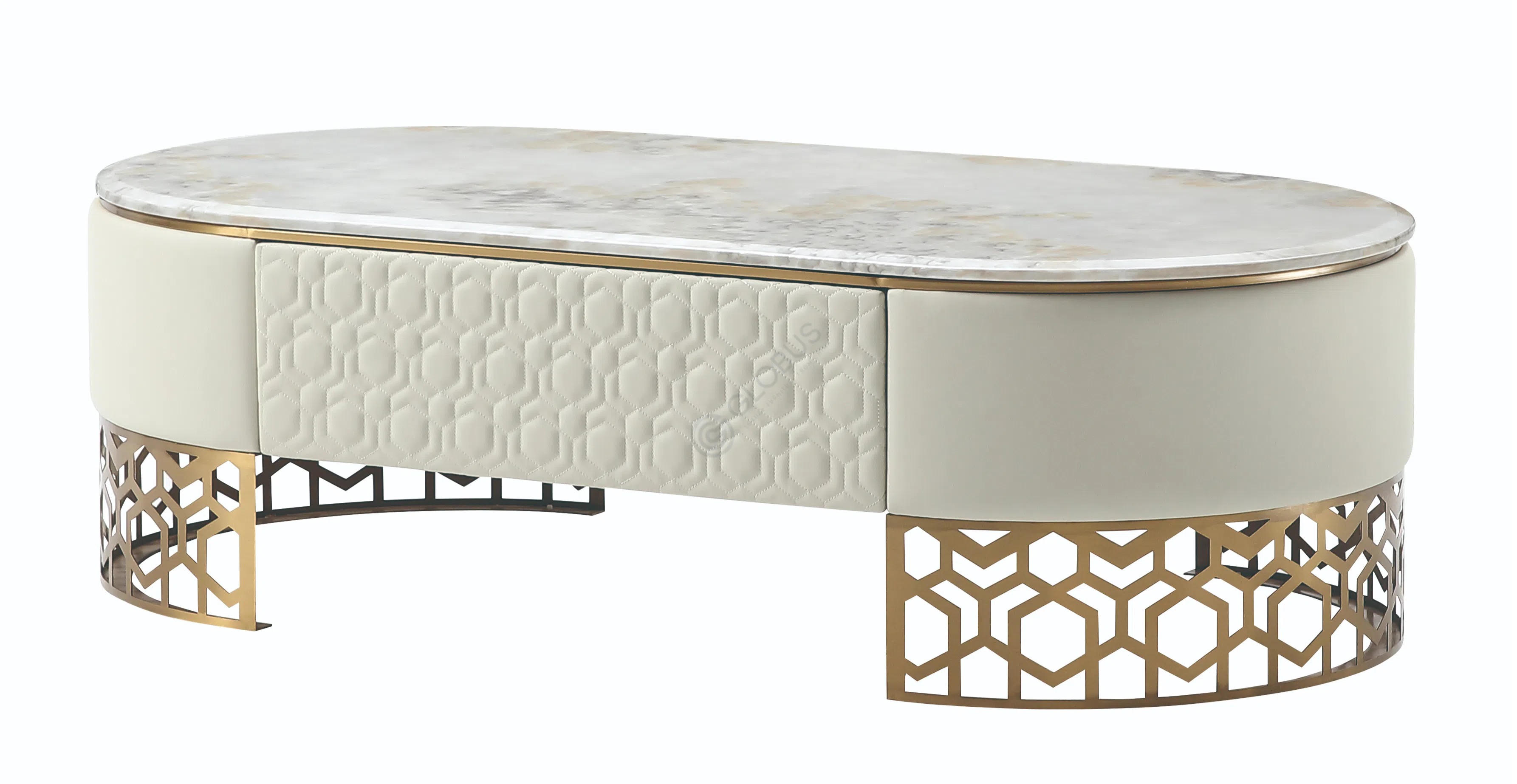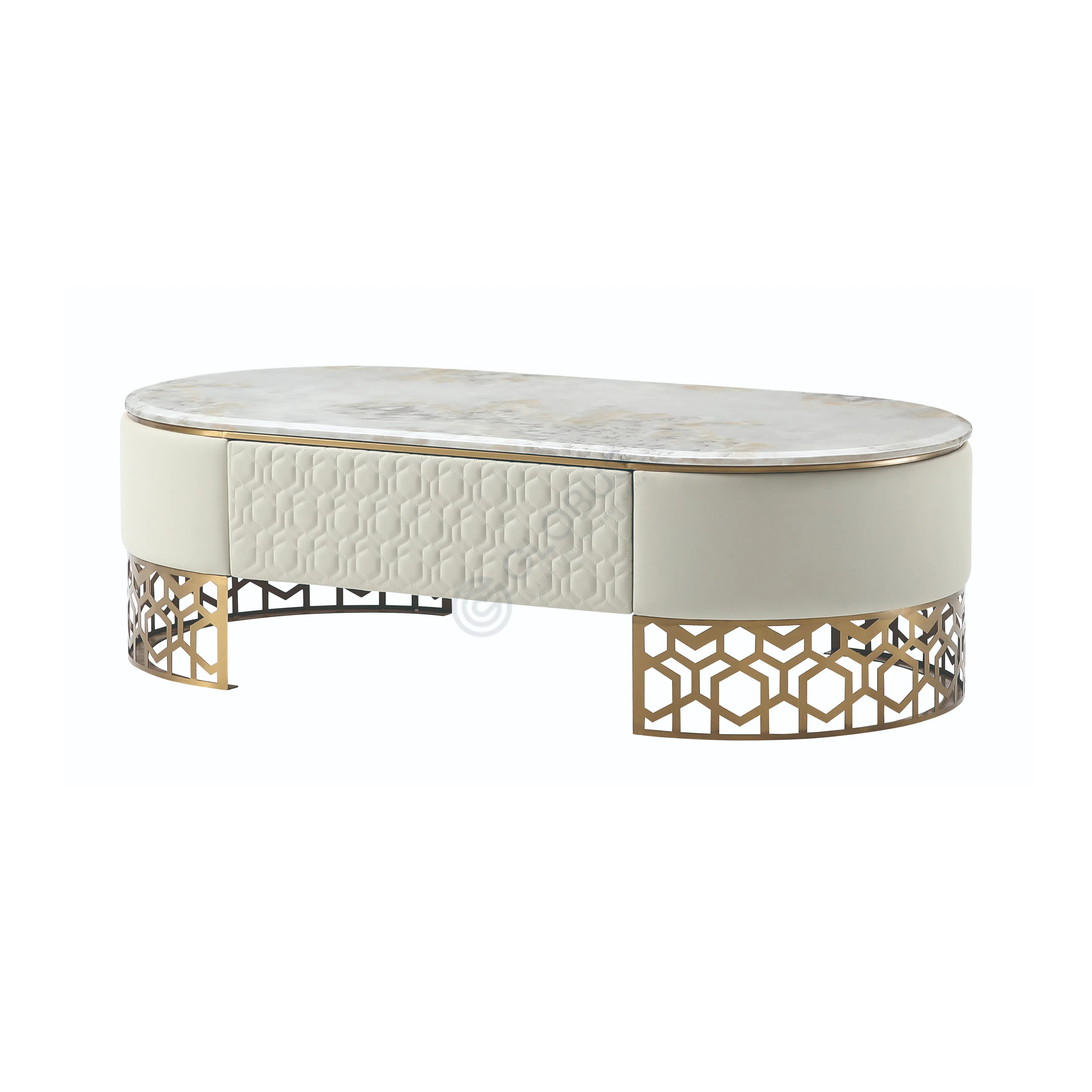 ТВ-тумба, выполненная из высококачественных материалов, является воплощением современного дизайна и функциональности. Элегантный искусственный мрамор в сочетании с блестящей нержавеющей сталью не только придает этому предмету мебели роскошный вид, но и обеспечивает его долговечность. Фасад, отделанный мягкой экокожей добавляет современное ощущение и прекрасно вписывается в любой интерьер. Прочная конструкция обеспечивает оптимальную поддержку для вашего телевизора, в то время как изящные элементы в дизайне основания делают эту тумбу не только практичной, но и выразительной деталью вашего пространства. Дополнительно, эта ТВ тумба с ее негромоздкими линиями и плавными формами подарит вашей гостиной лёгкость и простор.