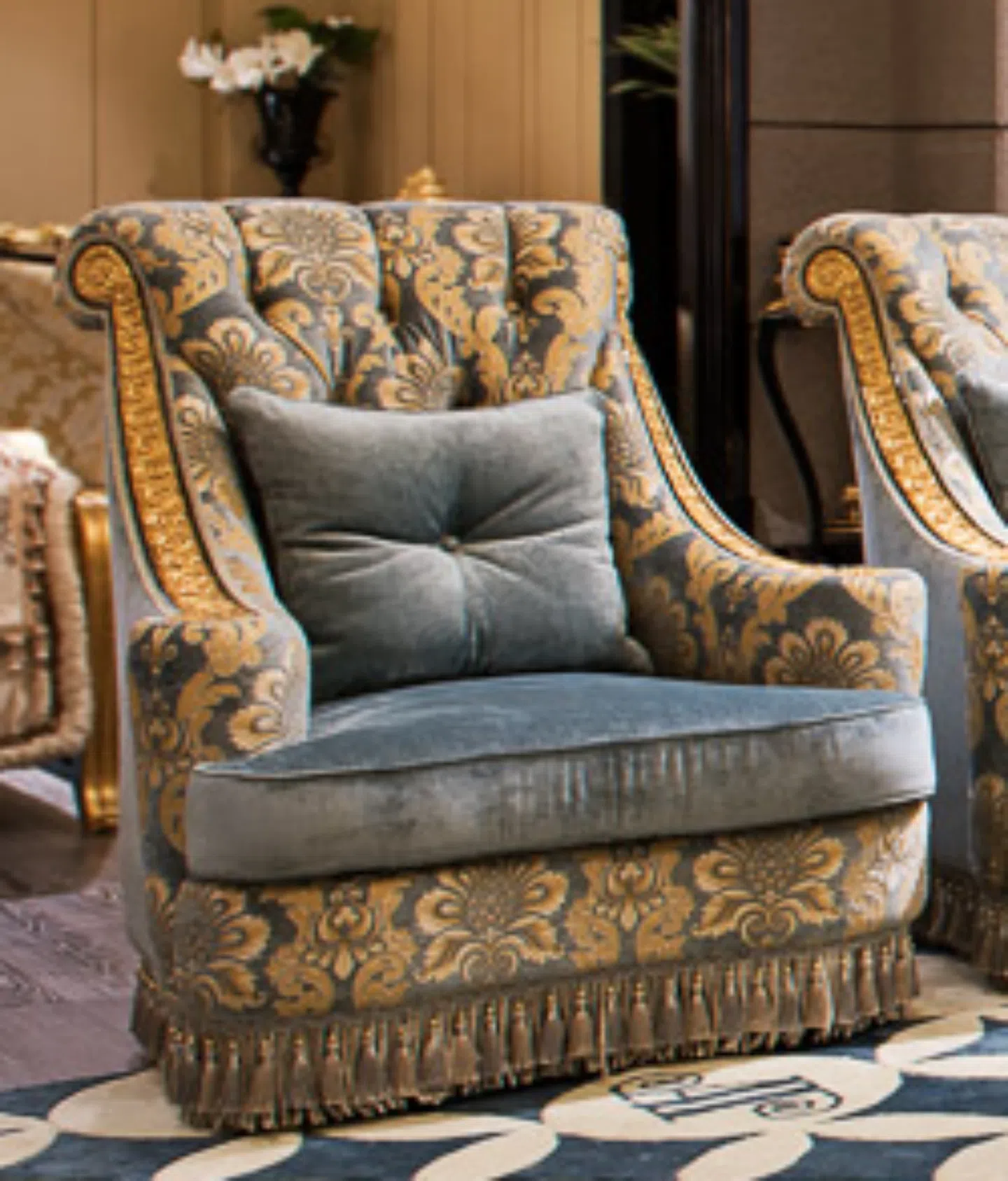 Обивка выполнена из высококачественного текстиля, невероятно приятного на ощупь. Изысканный узор на сиденье и подушках добавляет выразительности и подчеркивает статус изделия. В основе лежит прочный каркас из натурального дерева, обеспечивающий надежность и долговечность конструкции.
