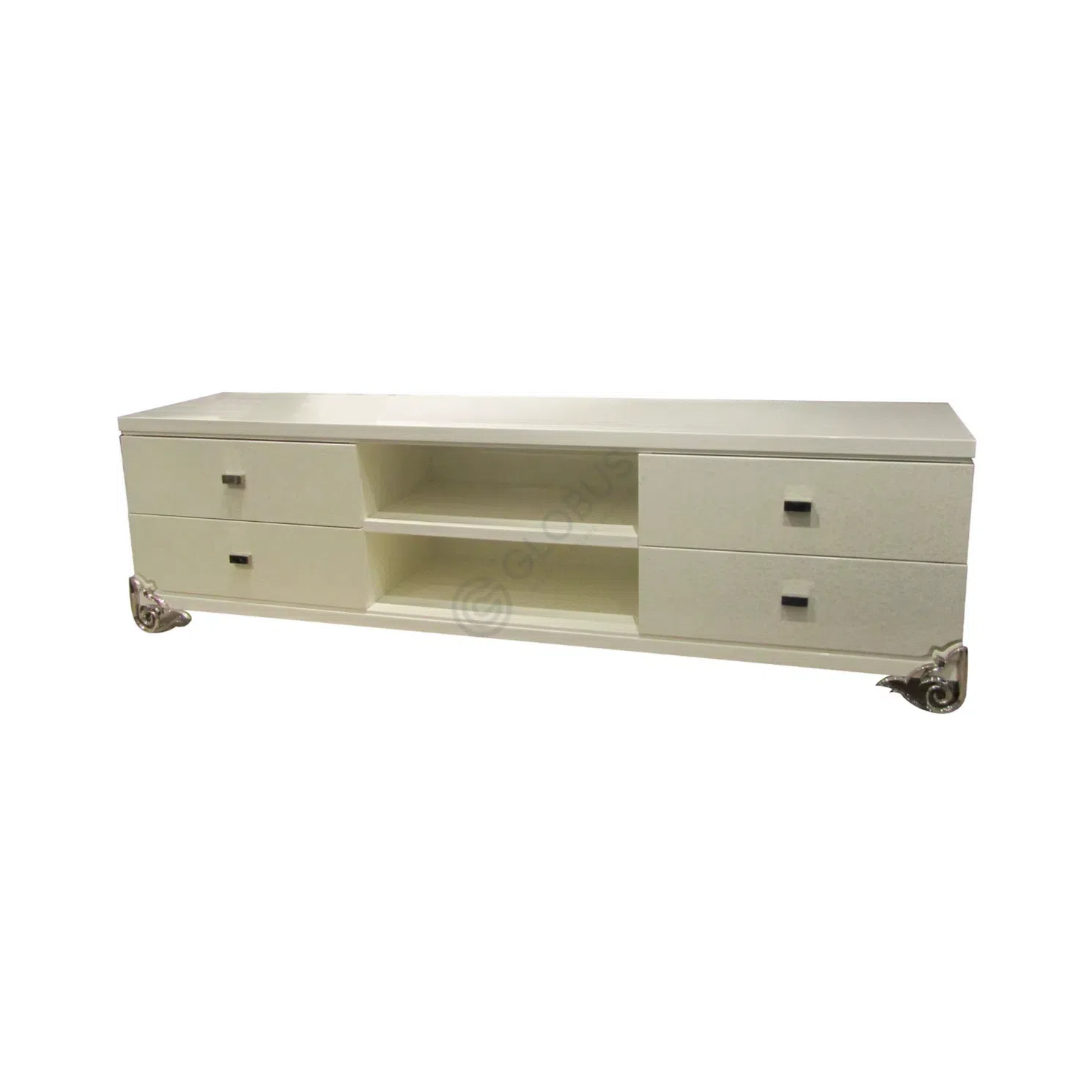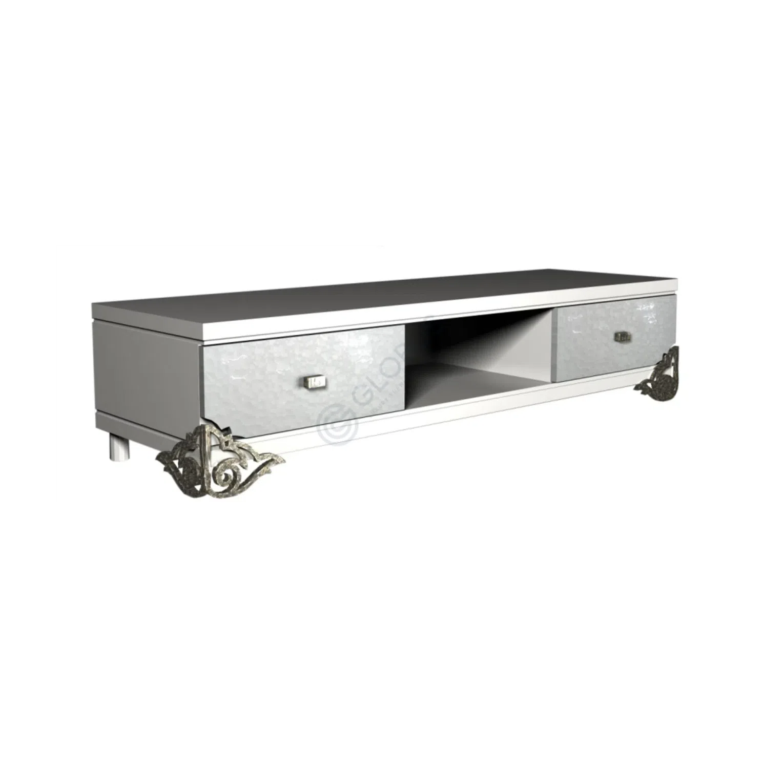 Особое внимание привлекают акцентные элементы из металла золотистого тона. Изящные ручки на двух выдвижных ящиках выполнены в современном стиле, предоставляя удобство использования. Угловые накладки у основания изделия представляют собой витиеватый орнамент, характерный для эпохи ар-деко, который придает тумбе индивидуальность и подчеркивает ее принадлежность к премиум-сегменту. Этот предмет мебели станет достойным дополнением интерьера, создавая атмосферу роскоши и комфорта.
