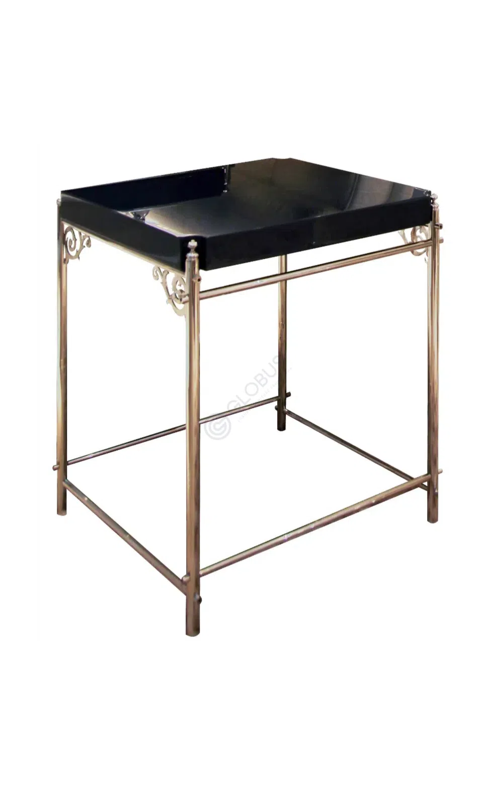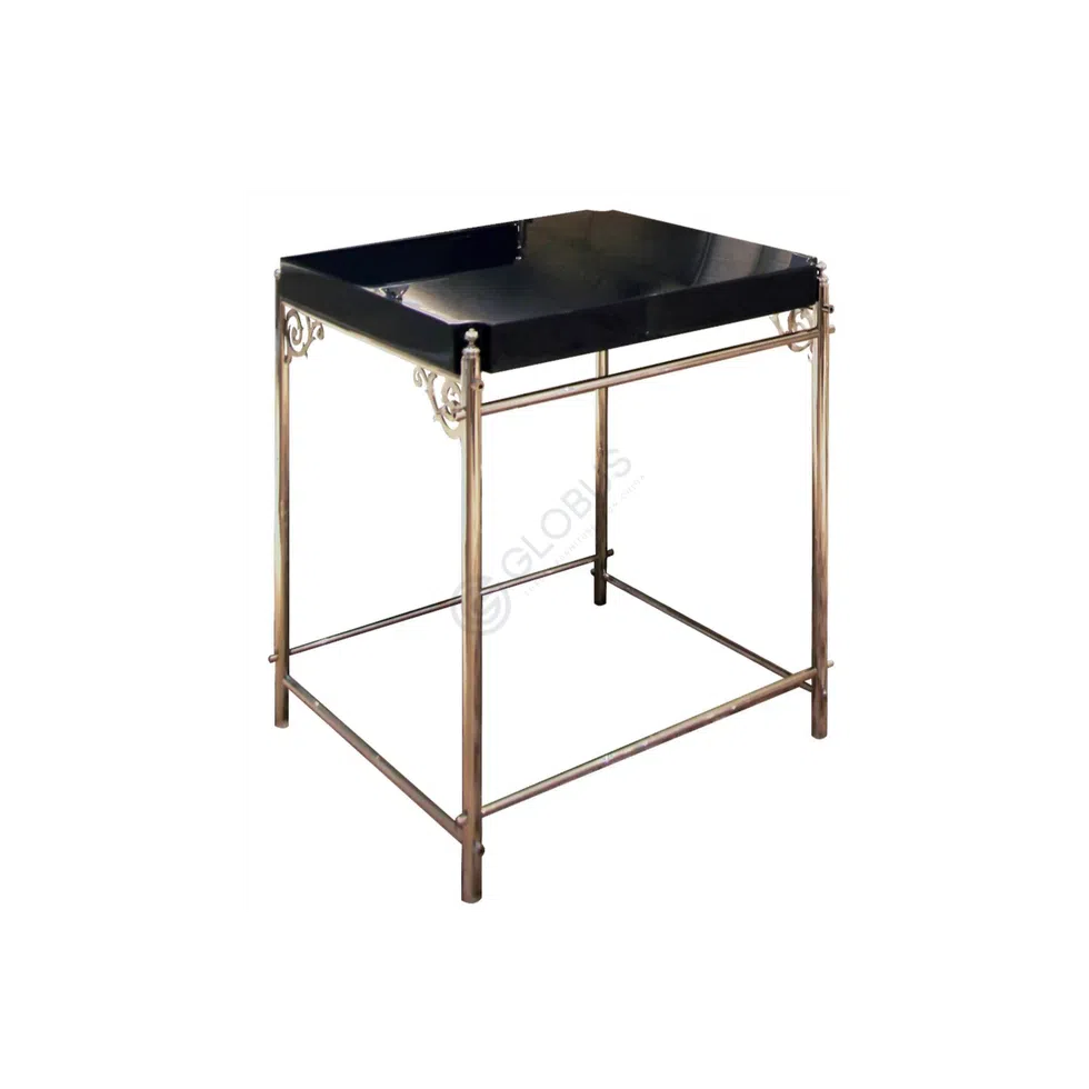 Основание выполнено из полированного металла, чей благородный блеск контрастирует с глубоким, темным оттенком квадратной столешницы. Деликатные декоративные акценты у кромки добавляют предмету особого шарма.