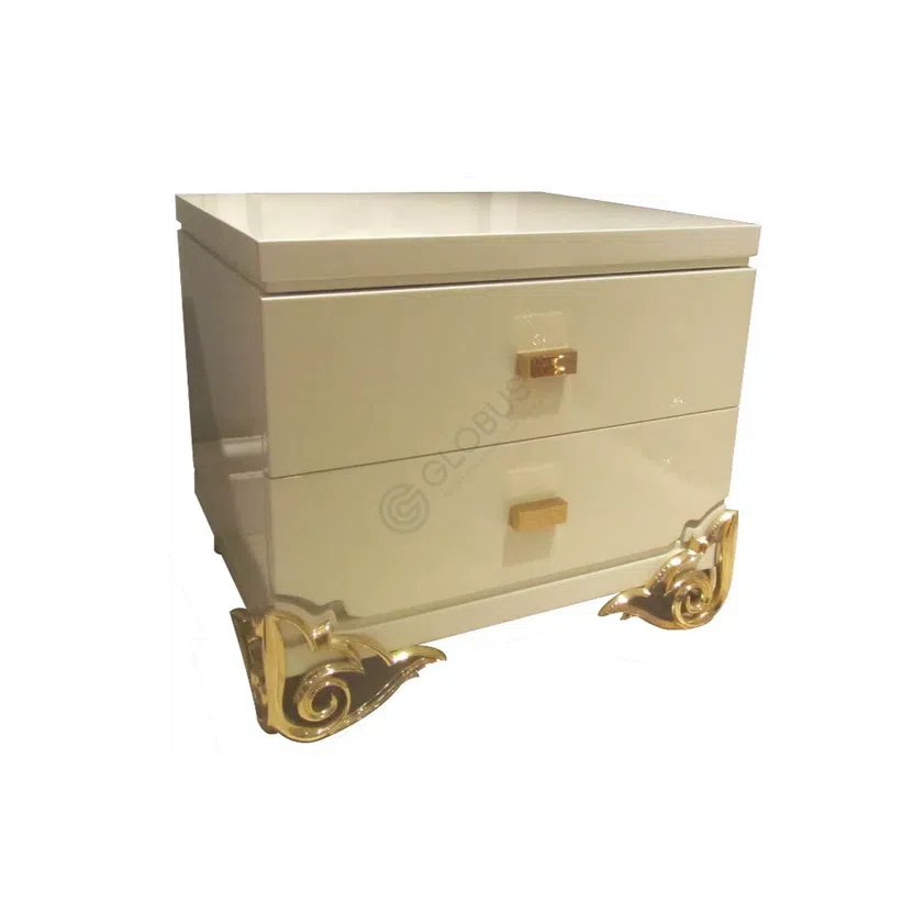 Дизайн тумбы отличают четкие линии и продуманная функциональность. Гладкая поверхность фасадов дополнена выдвижными ящиками для удобного хранения, а открытая ниша идеально подходит для размещения аппаратуры или декоративных предметов. Особое внимание привлекают фигурные металлические накладки на ножках, которые служат ярким декоративным акцентом, подчеркивающим принадлежность изделия к стилю ар-деко.