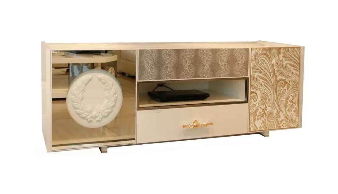 Поверхности буфета украшены разнообразными декоративными элементами. Здесь можно увидеть панели с богатым орнаментом, текстурированные вставки и элегантную стеклянную витрину, позволяющую продемонстрировать содержимое. Декоративный медальон и утонченная фурнитура завершают образ, подчеркивая внимание к деталям.