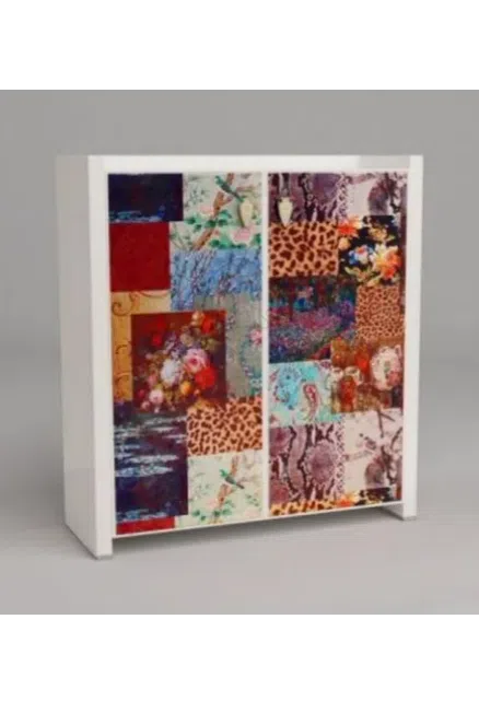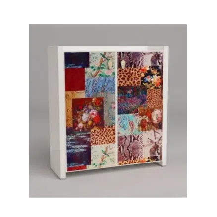Особое внимание привлекает фасад изделия. Две распашные двери украшены уникальным декоративным панно, составленным из множества выразительных изображений. Этот красочный коллаж придает предмету индивидуальность и превращает его в настоящий арт-объект, способный оживить любой интерьер.