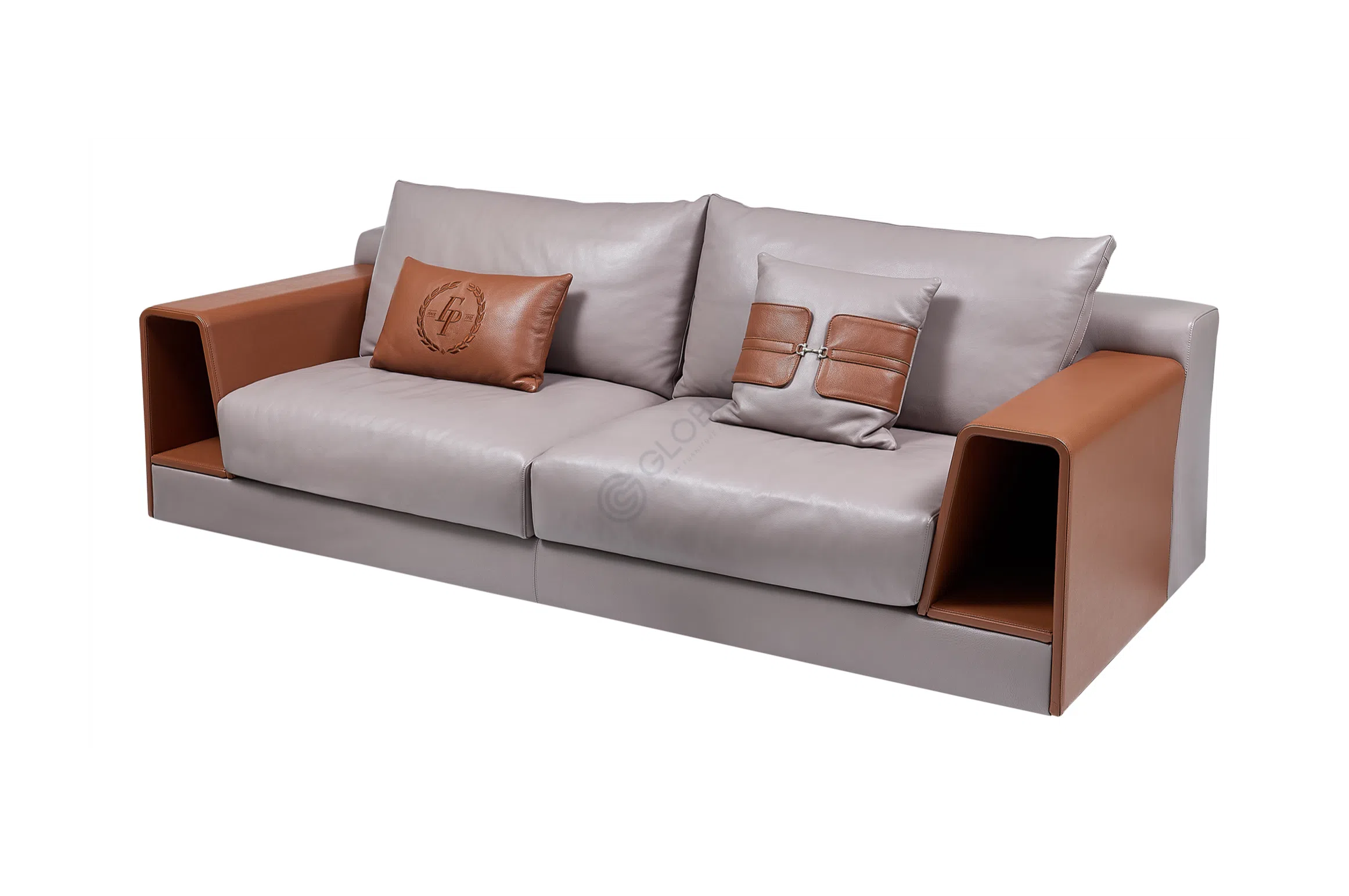 Основное покрытие выполнено из благородной кожи нежного оттенка, тактильно приятной и долговечной. Детали в виде контрастных стеганых подлокотников добавляют выразительности, подчеркивая продуманность каждой линии. В основе конструкции лежит натуральное дерево, обеспечивающее надежность и устойчивость на долгие годы.