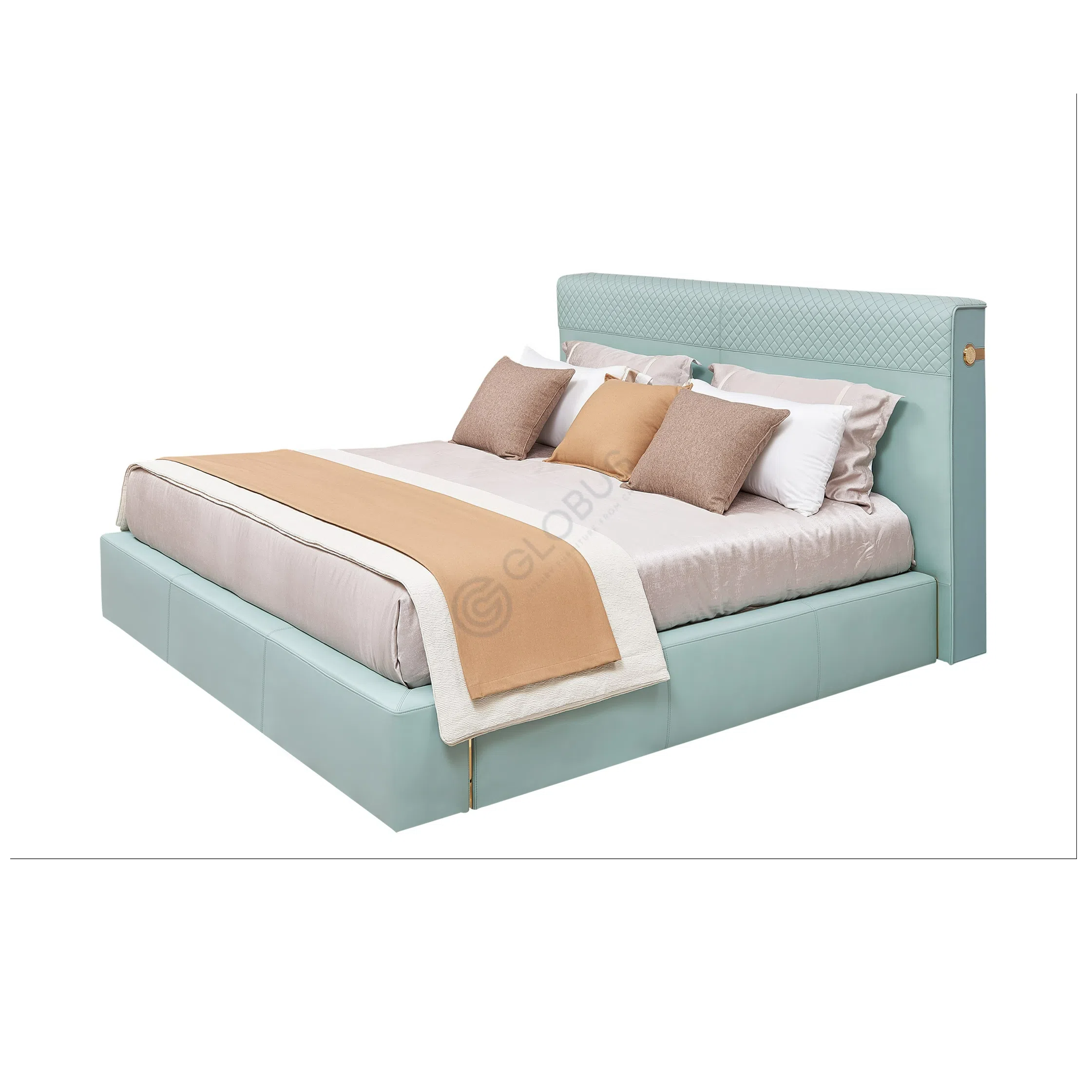 Каркас модели изготовлен из натурального дерева, обеспечивающего прочность и долговечность конструкции. В качестве обивки использована комбинация натуральной кожи и инновационной экокожи на микрофибре, предлагающая как превосходный внешний вид, так и приятные тактильные ощущения. Металлические детали, включая основание и декоративные элементы на боковинах, добавляют изделию выразительности и роскошного сияния.
