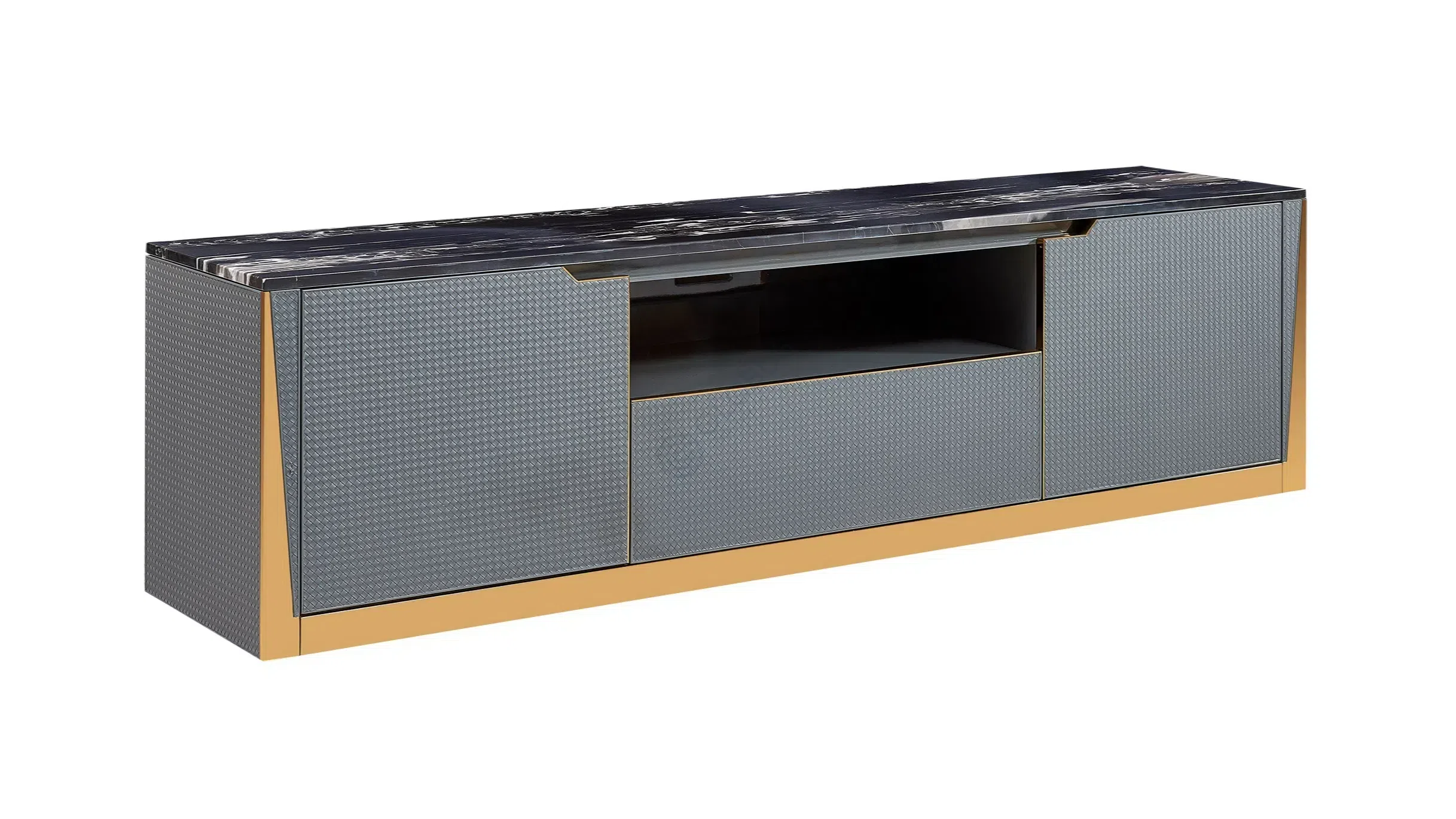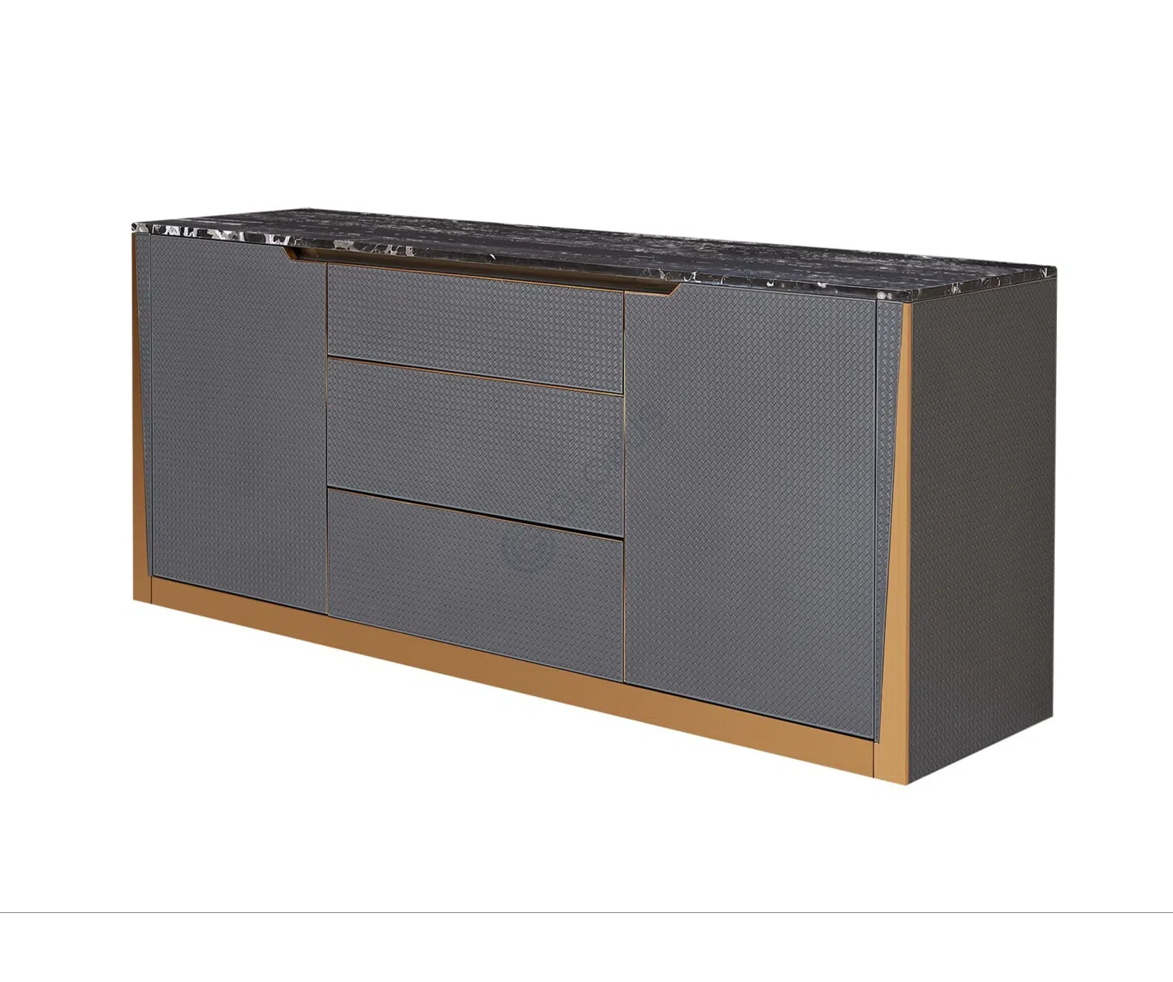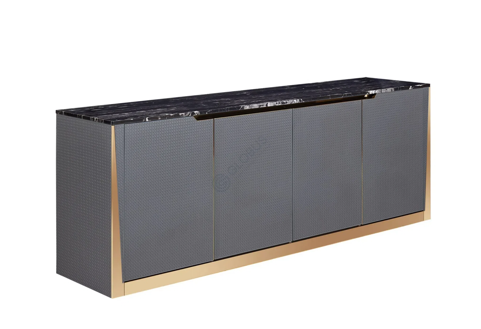Верхняя поверхность выполнена из натурального мрамора с глубоким, выразительным рисунком прожилок, что придает изделию неповторимую уникальность. Боковые части обтянуты экокожей на микрофибре с деликатным ромбовидным узором, добавляющим визуальной глубины и приятных тактильных ощущений. Элементы из нержавеющей стали с отделкой под золото изящно обрамляют фасад, подчеркивая геометрию и придавая блеск. Основание конструкции, предположительно, изготовлено с использованием натурального дерева и фанеры, обеспечивая надежность и долговечность.