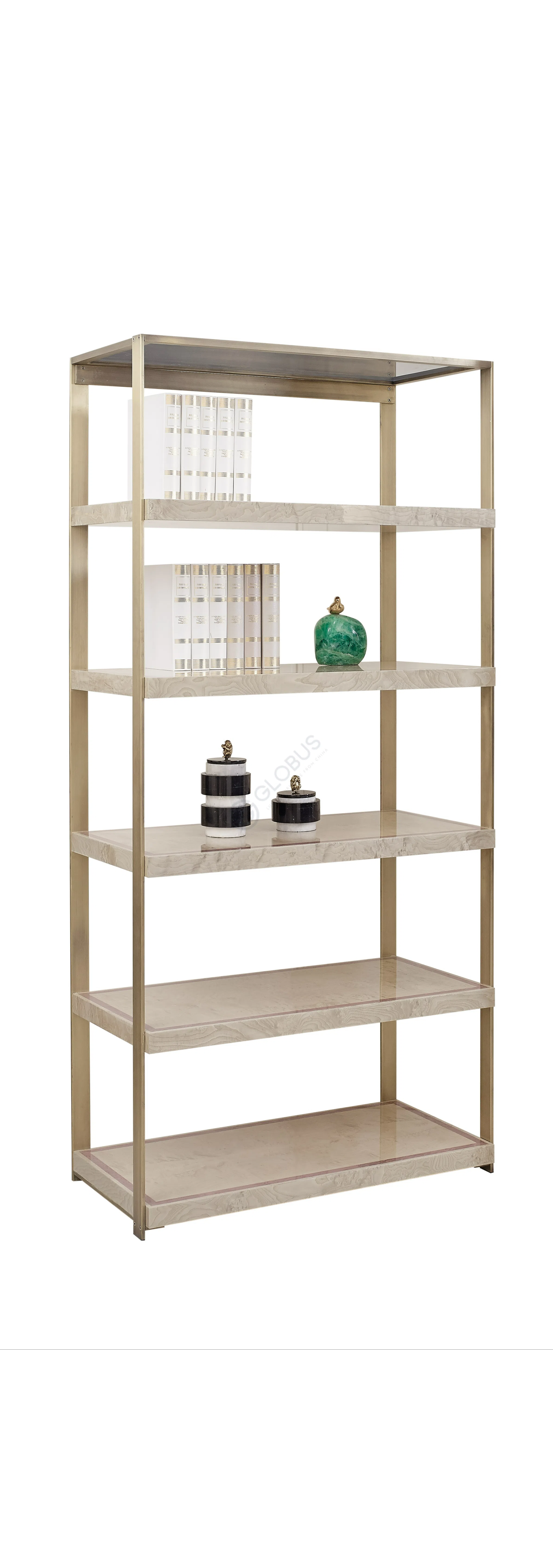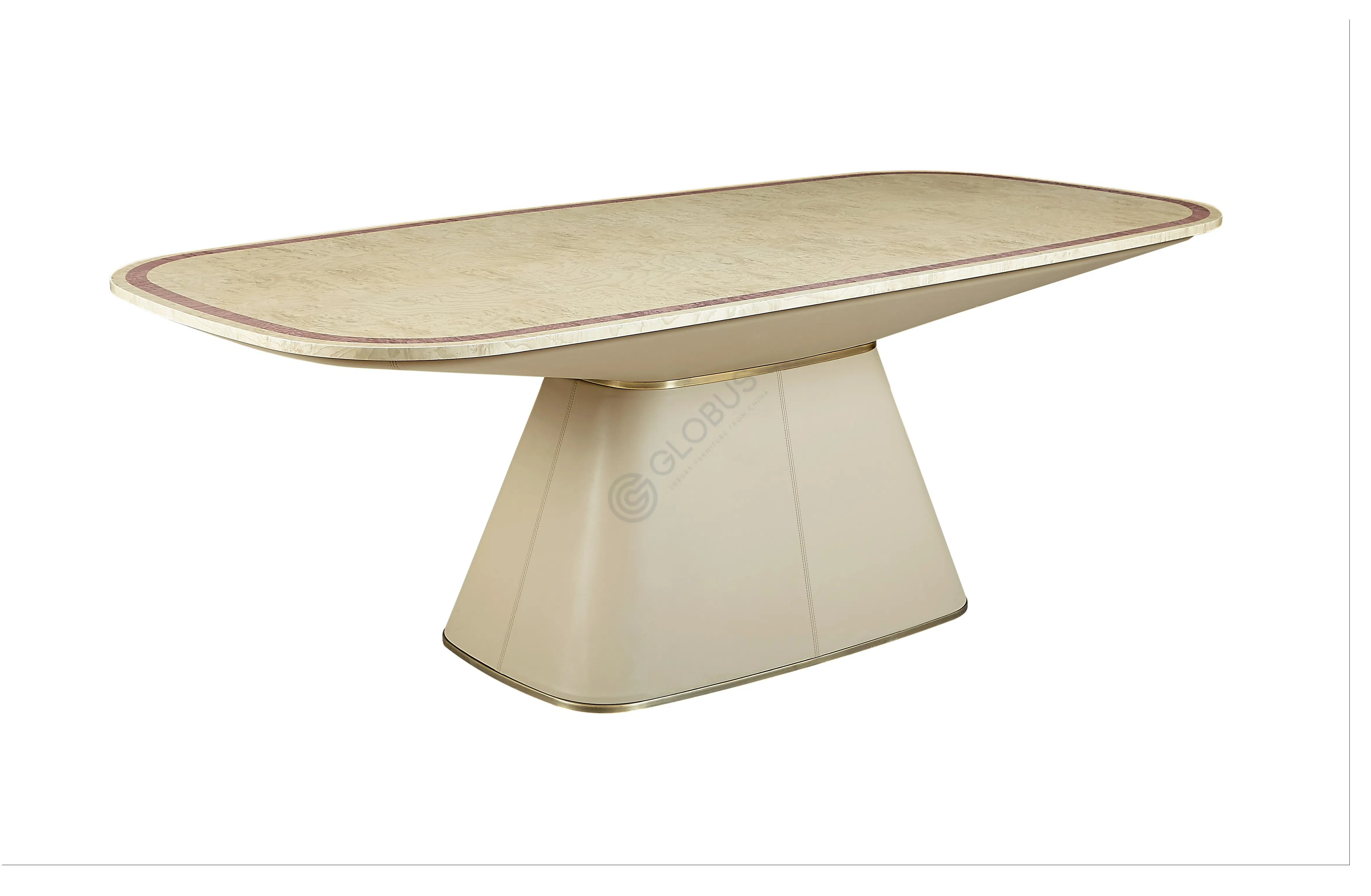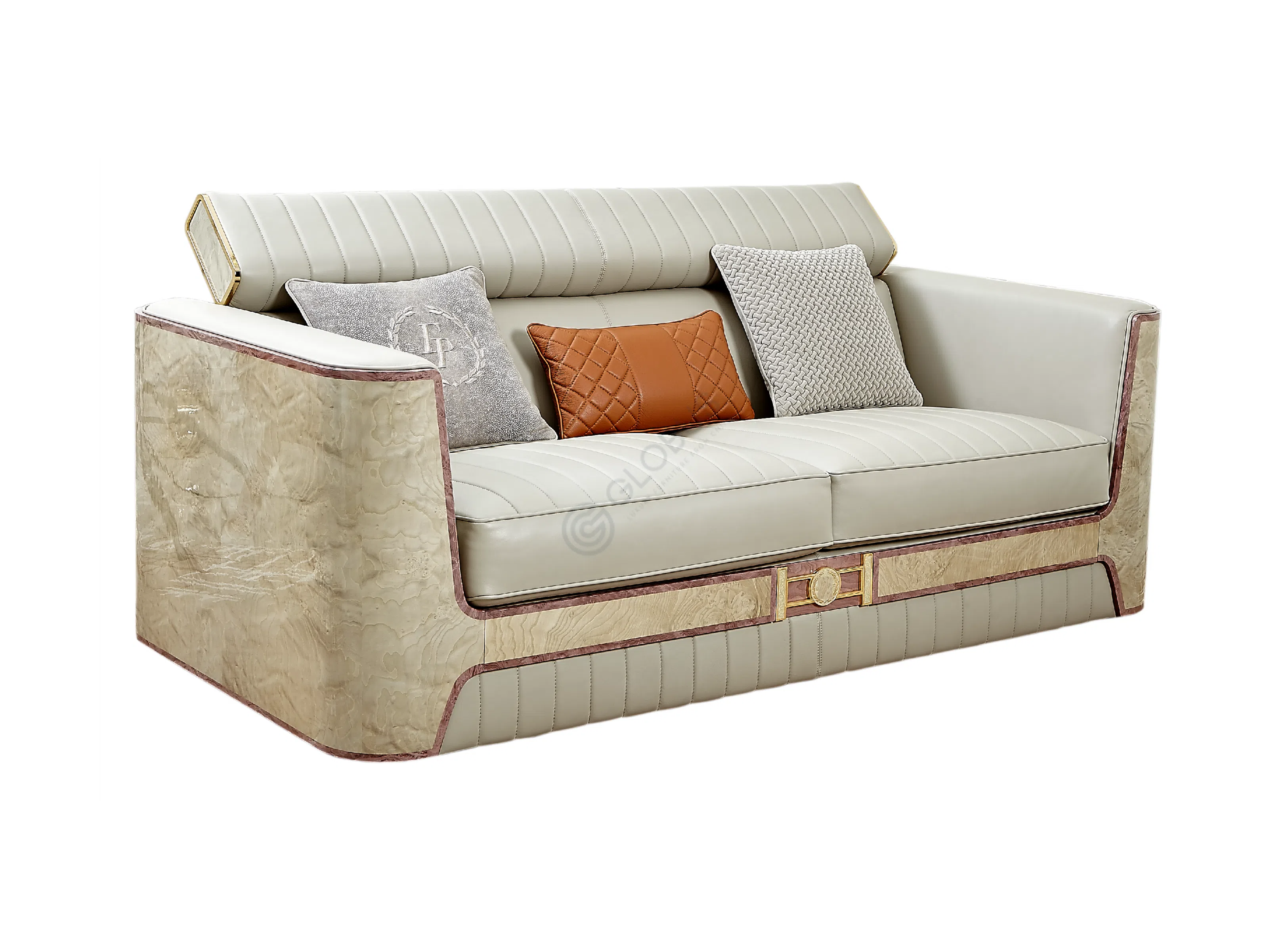 Сиденье и спинка, обтянутые натуральной кожей, предлагают исключительный комфорт и долговечность. Вертикальная прострочка на высокой спинке придает дополнительную элегантность. Устойчивое основание изготовлено из полированного металла, чей блеск акцентирует роскошь изделия. Внутренняя конструкция и элементы отделки включают использование натурального дерева и природного мрамора, подтверждая высокий стандарт качества и внимание к деталям.