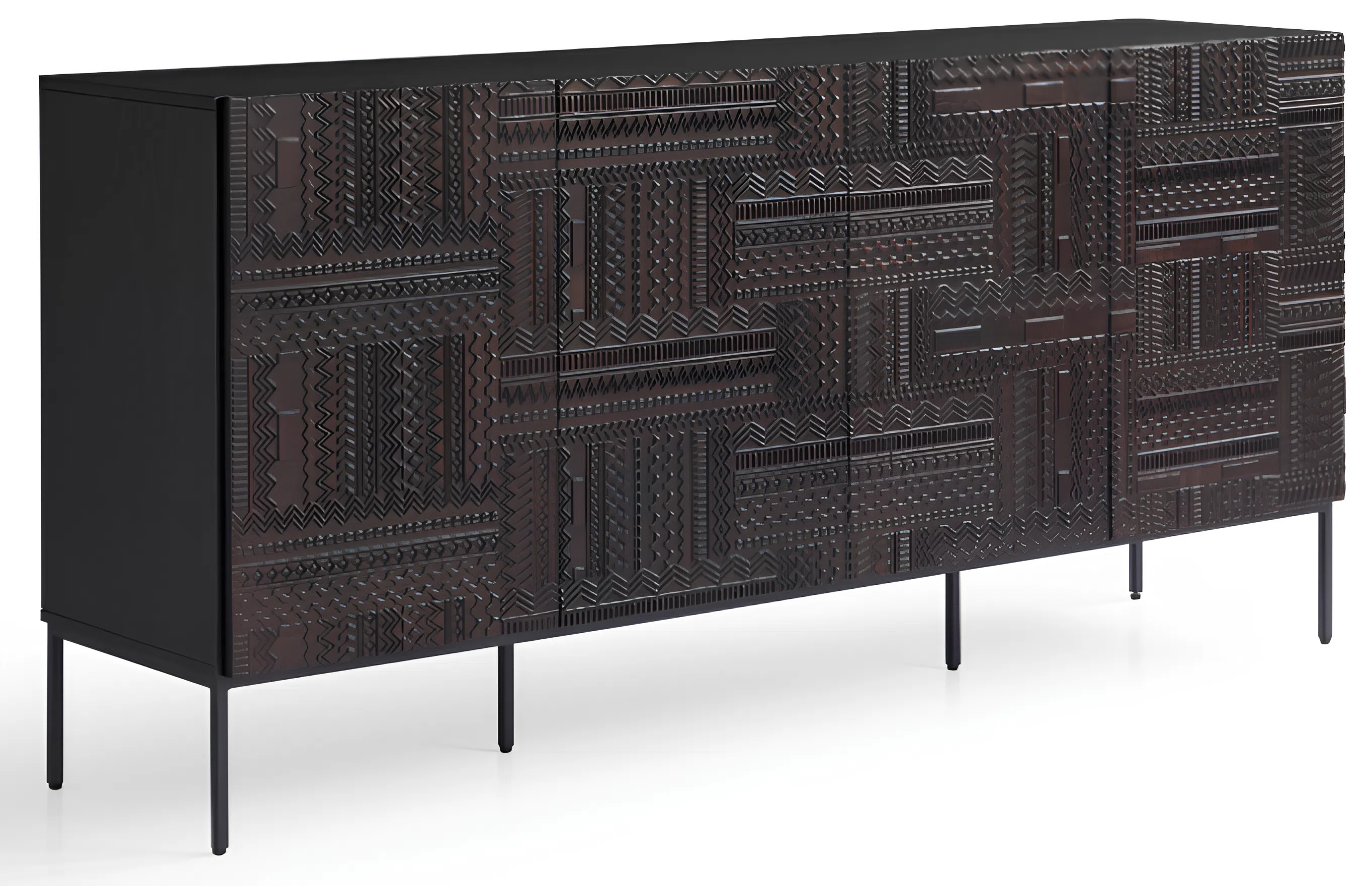ТВ тумба сочетает в себе современные формы и этнические мотивы, создавая выразительный акцент в интерьере гостиной или спальни. Поверхности фасадов украшены сложной резьбой, обогащающей образ тумбы необычной текстурой и глубокими деталями.