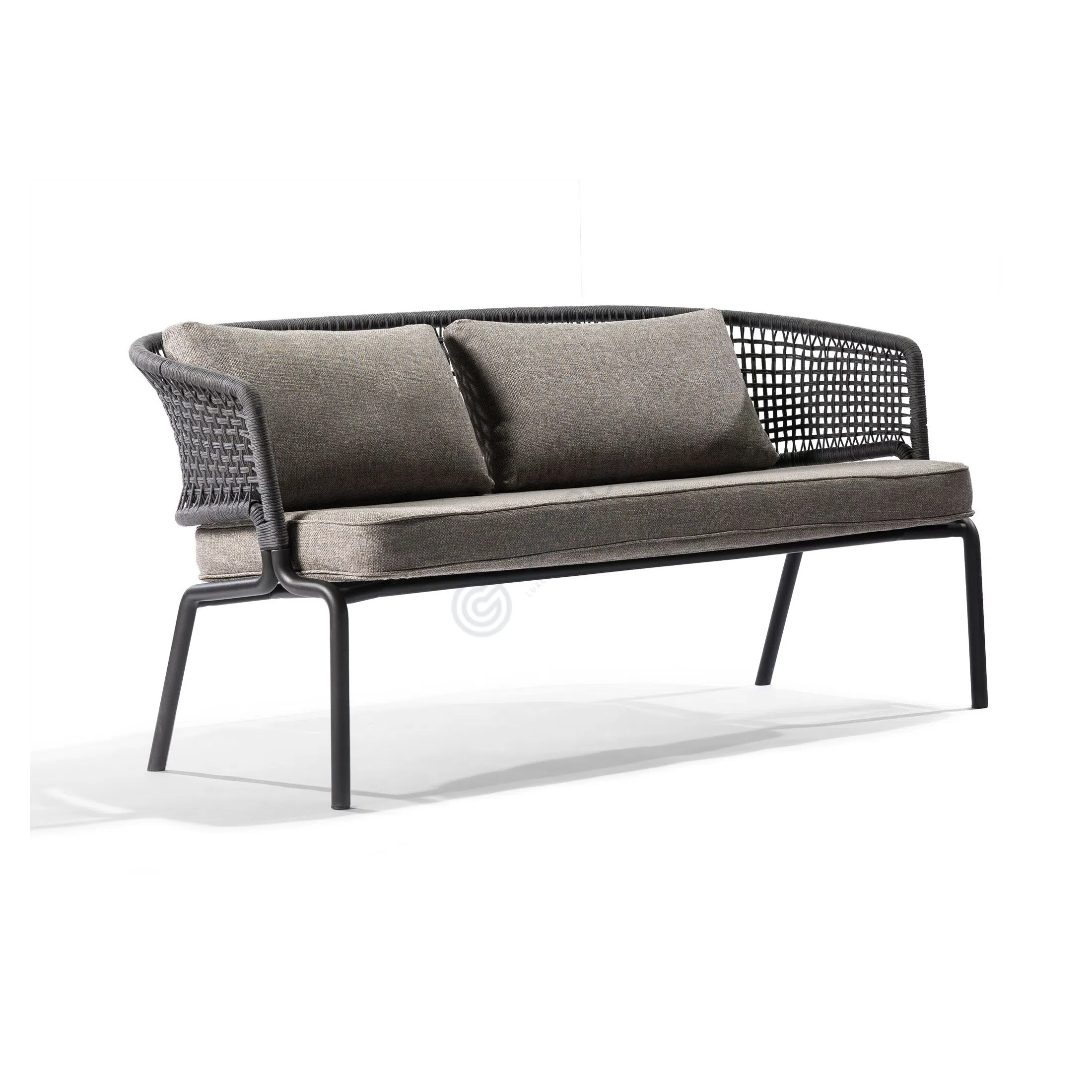 Легкий, но прочный алюминиевый каркас служит надежной основой, устойчивой к воздействию природы. Спинка и подлокотники искусно сплетены из долговечной веревки, создавая изящную и поддерживающую форму, которая одновременно является ключевым элементом дизайна. Дополняет ансамбль комфортабельное сиденье с обивкой из высококачественного текстиля, специально предназначенного для использования на улице.