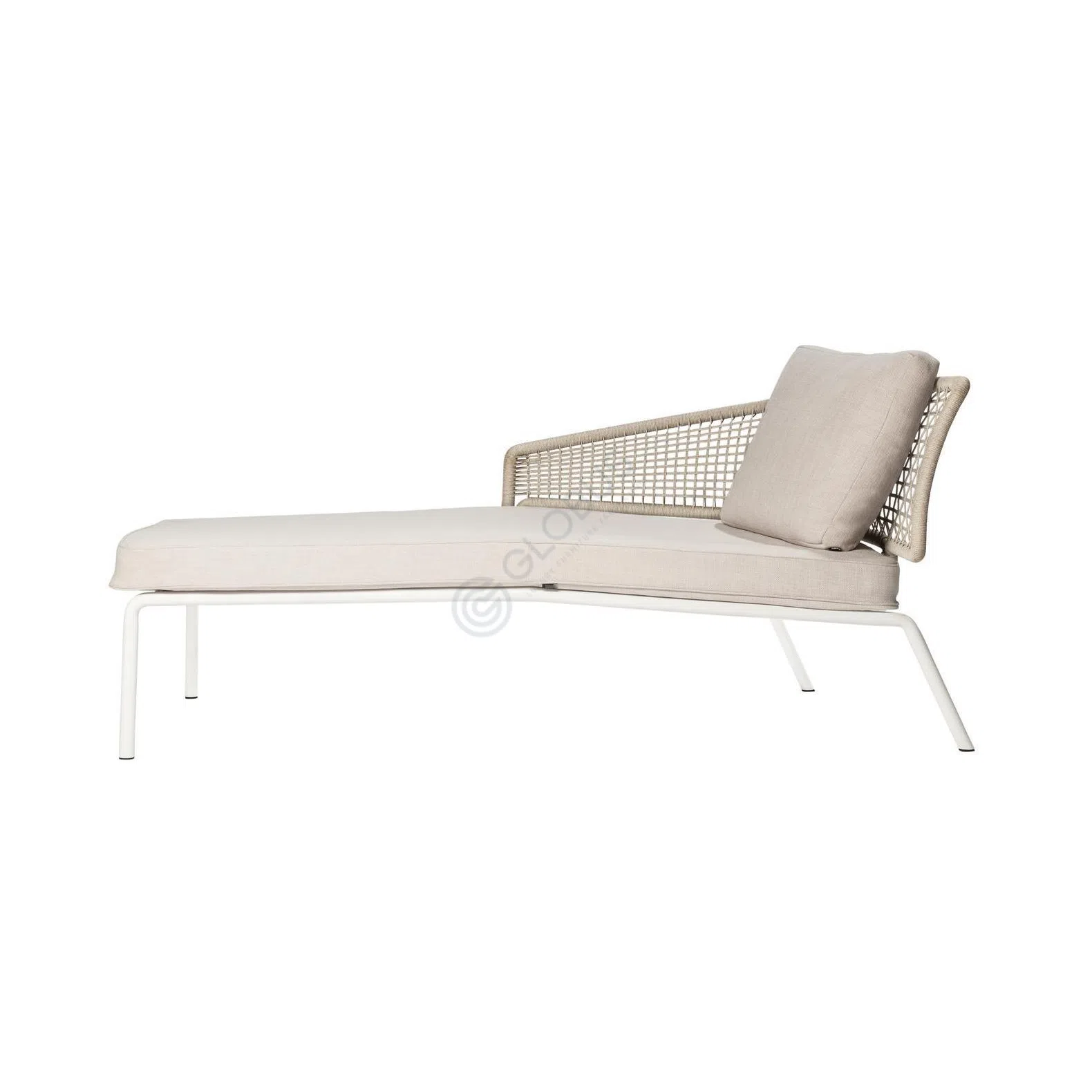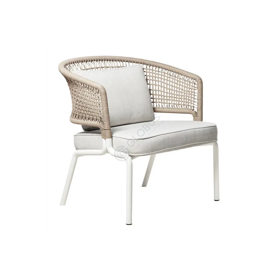 Легкий, но прочный алюминиевый каркас служит надежной основой, устойчивой к воздействию природы. Спинка и подлокотники искусно сплетены из долговечной веревки, создавая изящную и поддерживающую форму, которая одновременно является ключевым элементом дизайна. Дополняет ансамбль комфортабельное сиденье с обивкой из высококачественного текстиля, специально предназначенного для использования на улице.