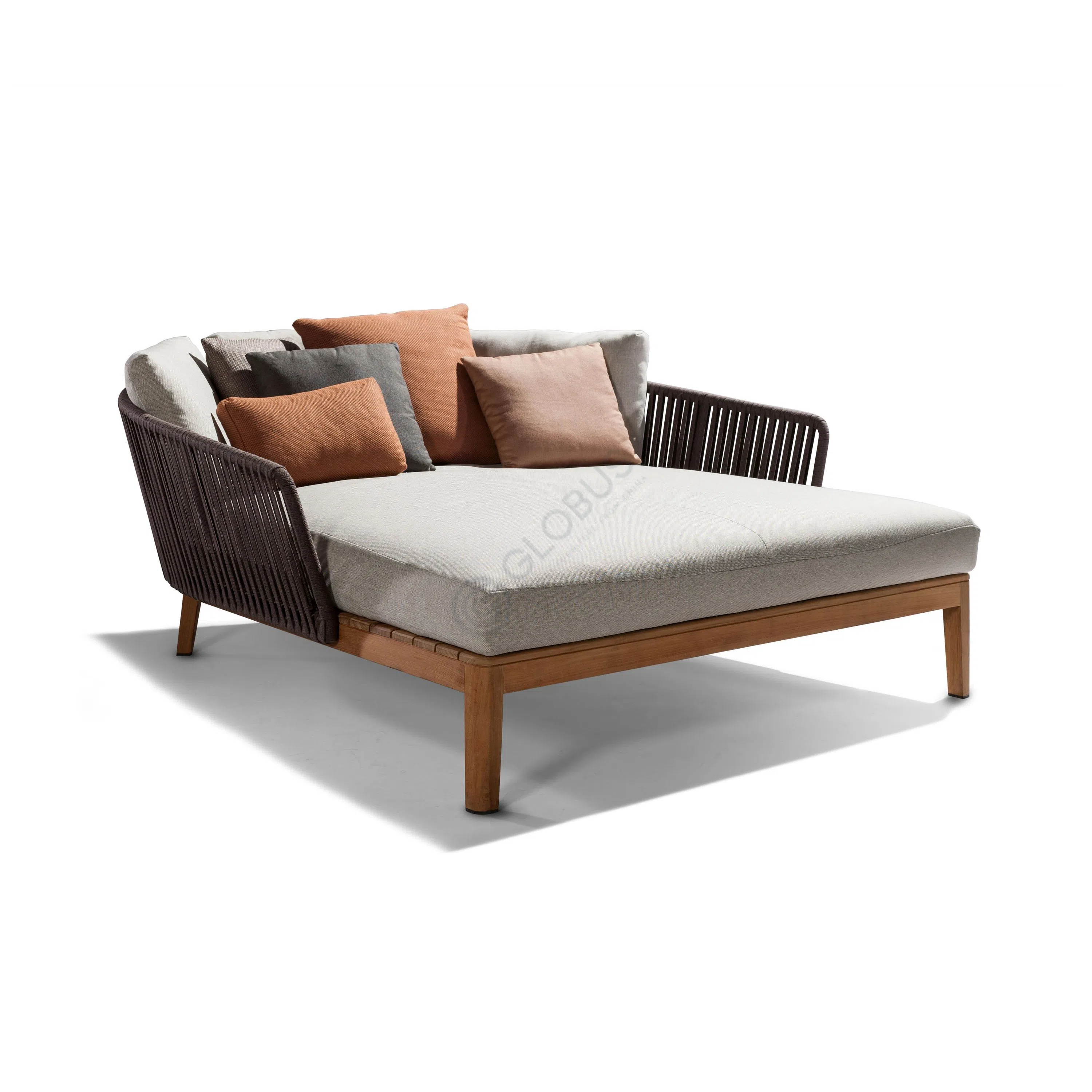 Основание предмета выполнено из теплого натурального дерева, подчеркивающего его связь с природой. Боковые части и спинка сформированы изящным плетением прочной веревки, создающим легкий, но в то же время обволакивающий контур. Внутри этой структуры расположены мягкие, объемные подушки, обитые качественным текстилем, приглашающие погрузиться в комфорт. Для надежности конструкции использован прочный алюминий.