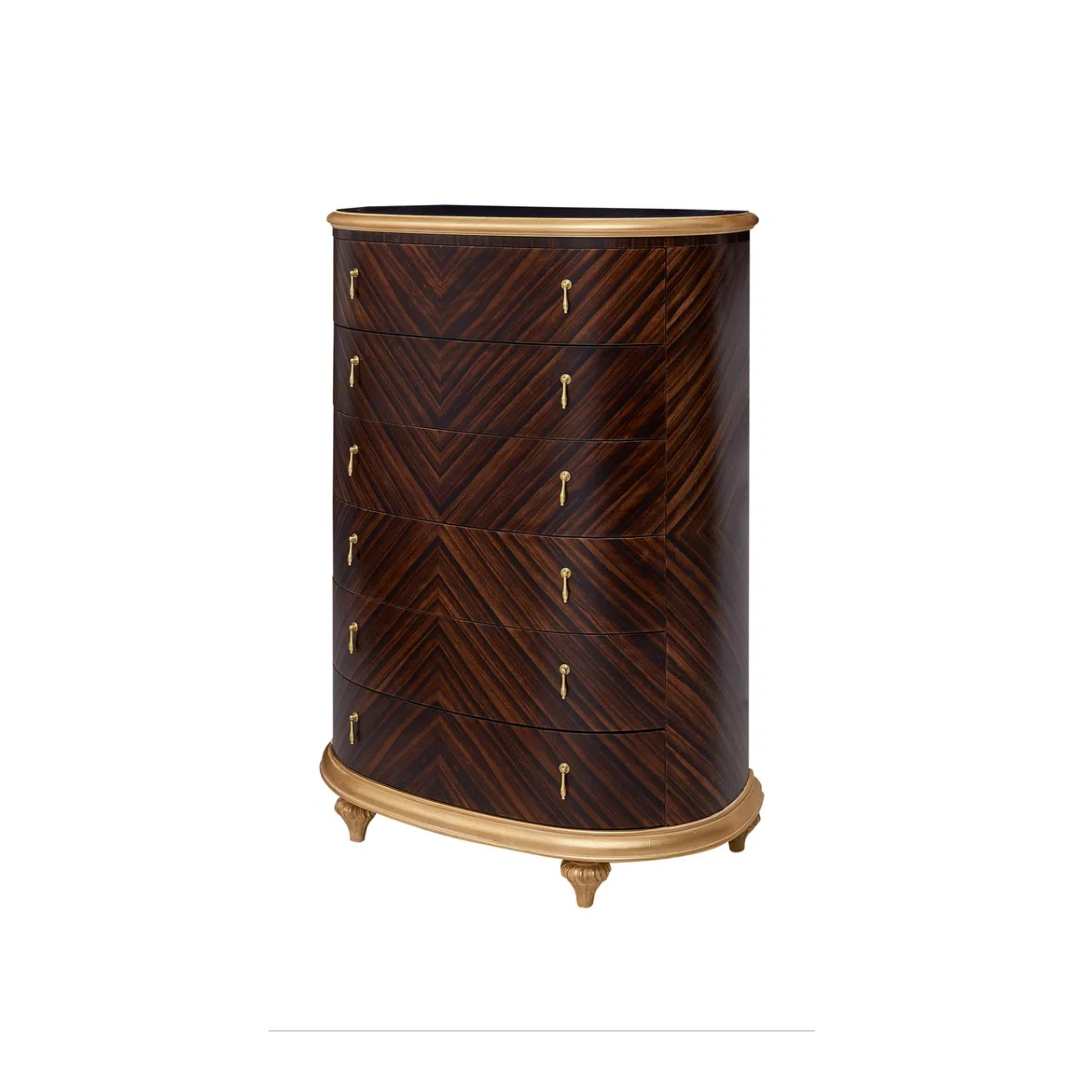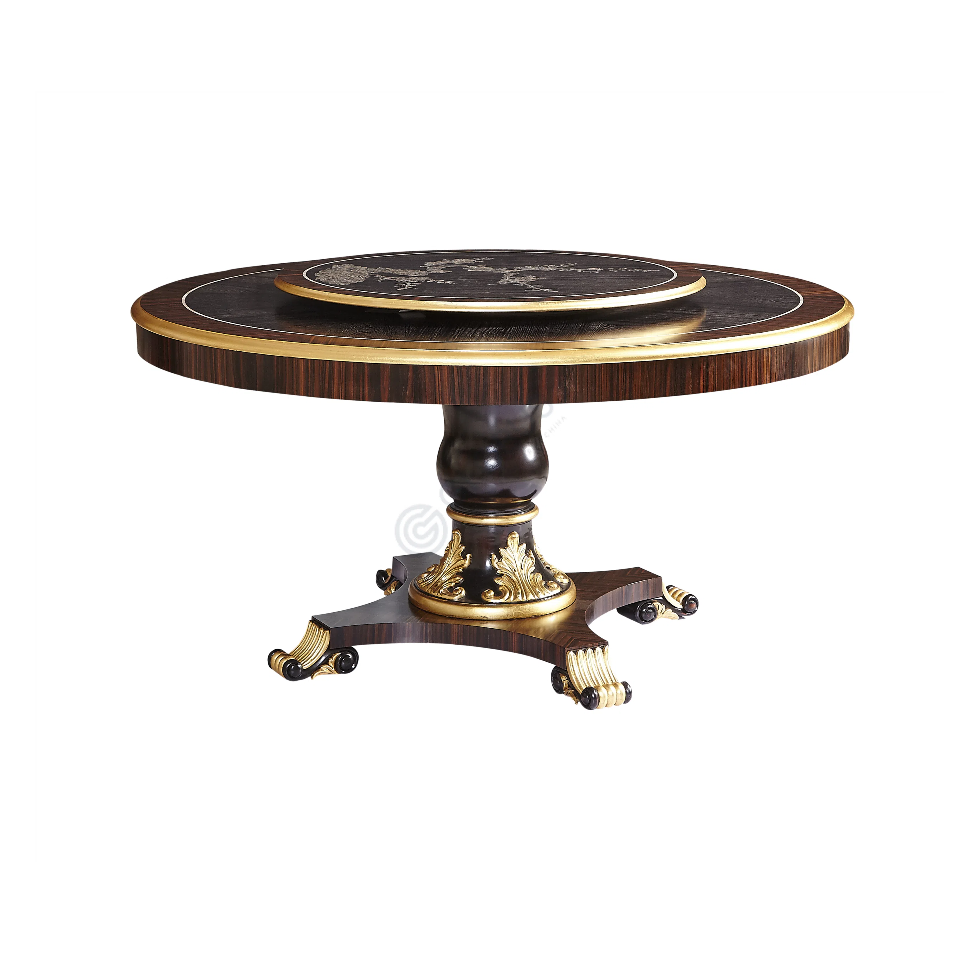 Круглая столешница облицована высококачественным шпоном с красивой текстурой дерева, создавая темную, глубокую поверхность. Ее кайма, обработанная с вниманием к деталям, завершает образ, добавляя контраст и изысканность.