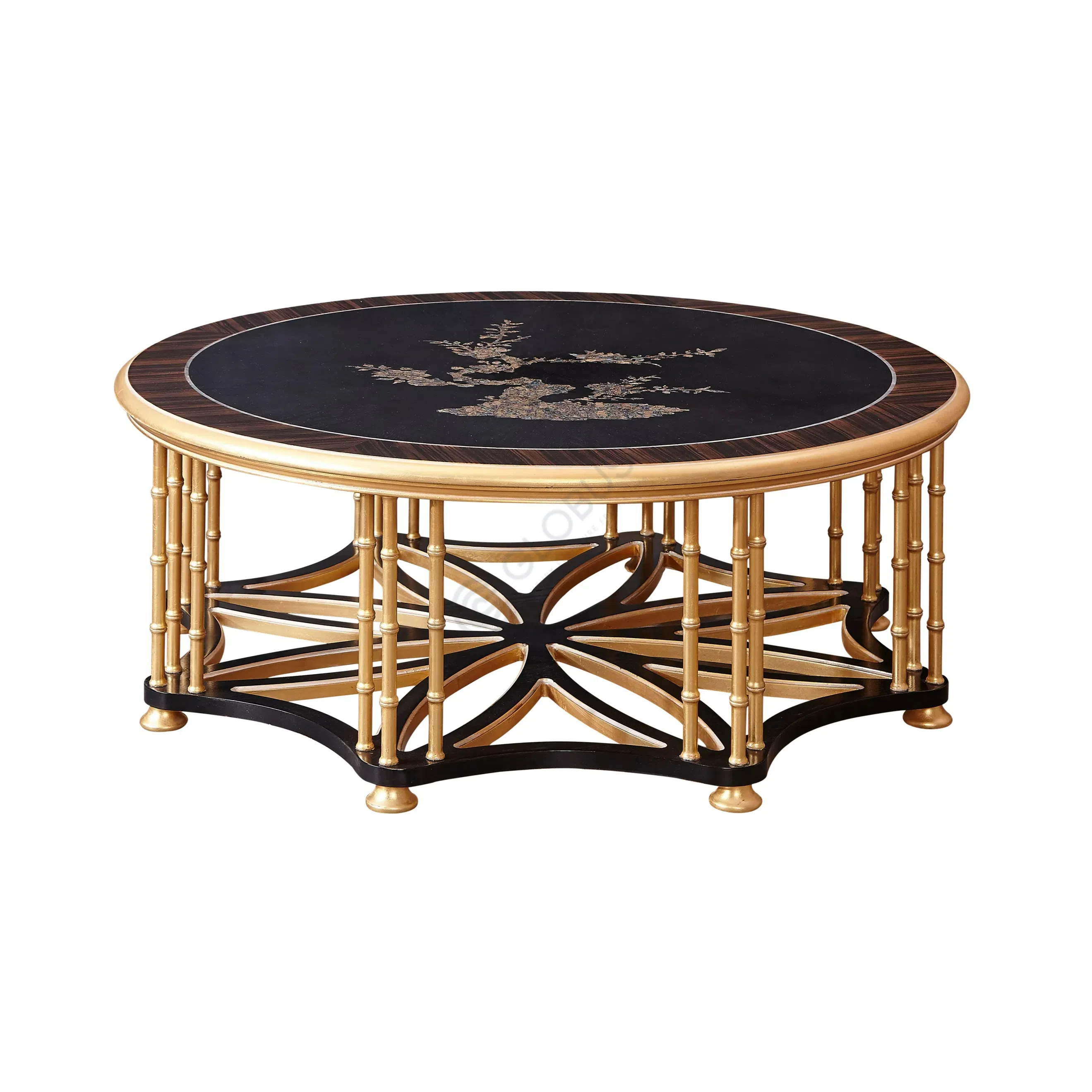 Его конструкция отличается особой элегантностью. Ножки, выполненные из натурального дерева и стилизованные под стебли бамбука, покрыты нежной патиной золотистого оттенка. Основание, изготовленное с использованием прочной фанеры, дополнено выразительным декоративным узором, который подчеркивает сложный дизайн предмета.