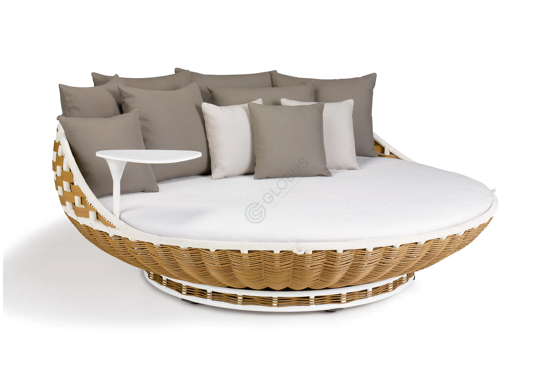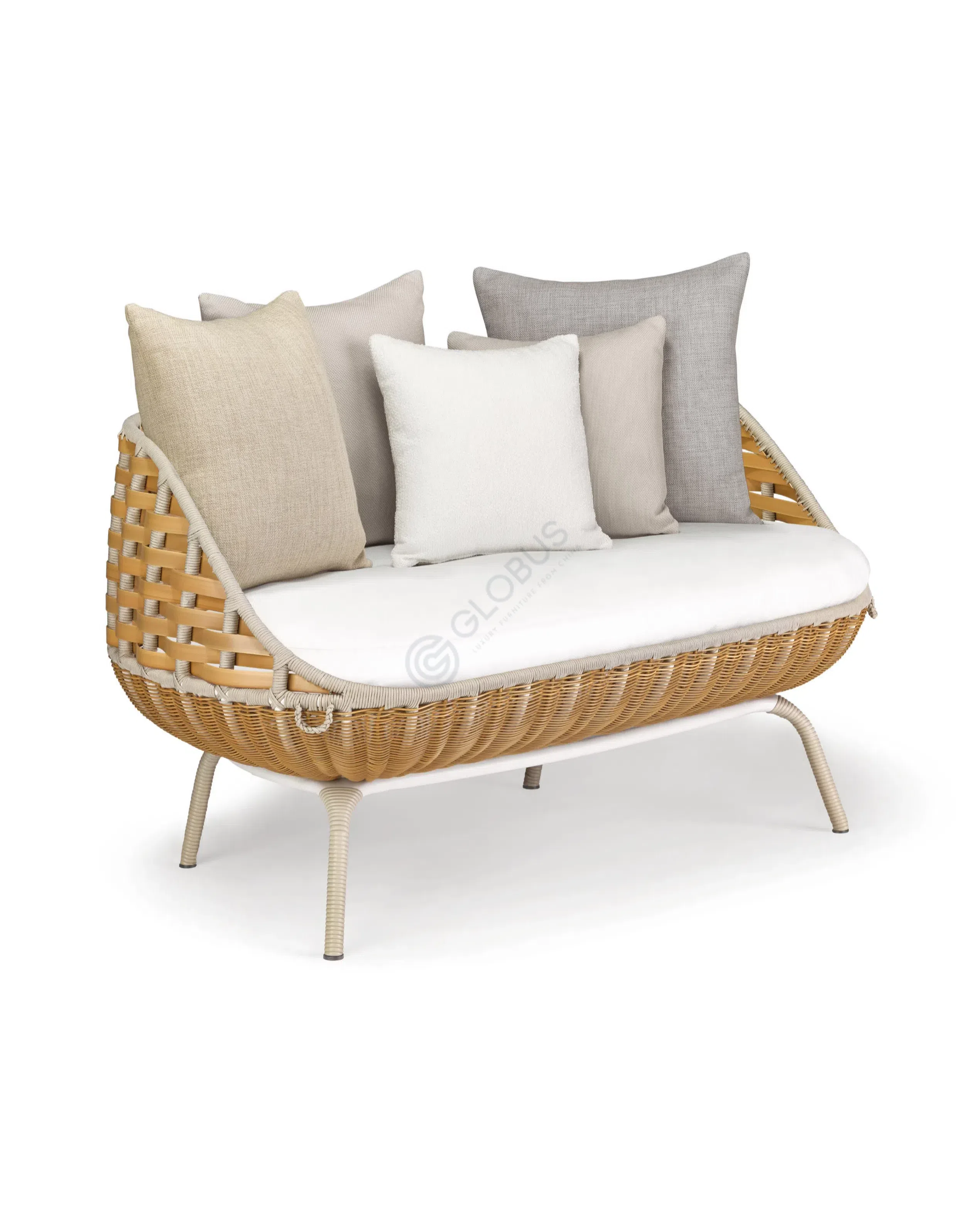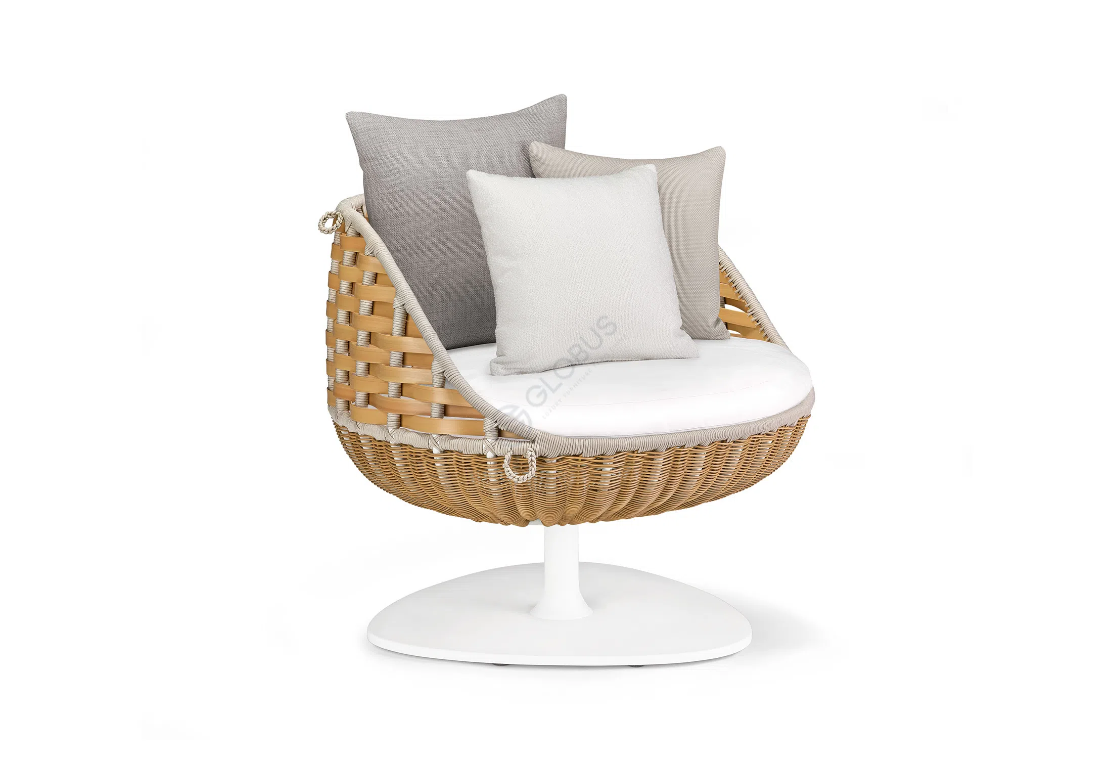 Каркас изделия выполнен из прочного алюминия, гарантирующего долговечность и легкость конструкции, что особенно важно для подвесной модели. Изящное плетение из искусственного ротанга в светлом оттенке придает поверхности воздушность и теплоту, органично вписываясь в экостиль. Мягкие подушки и матрас, обтянутые высококачественным текстилем, дарят исключительную тактильность и обеспечивают максимальный уют.