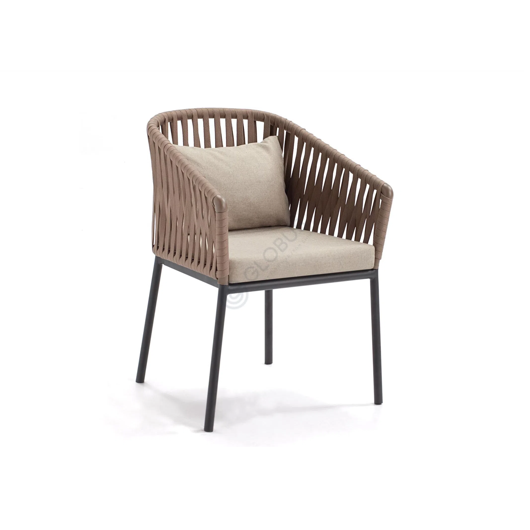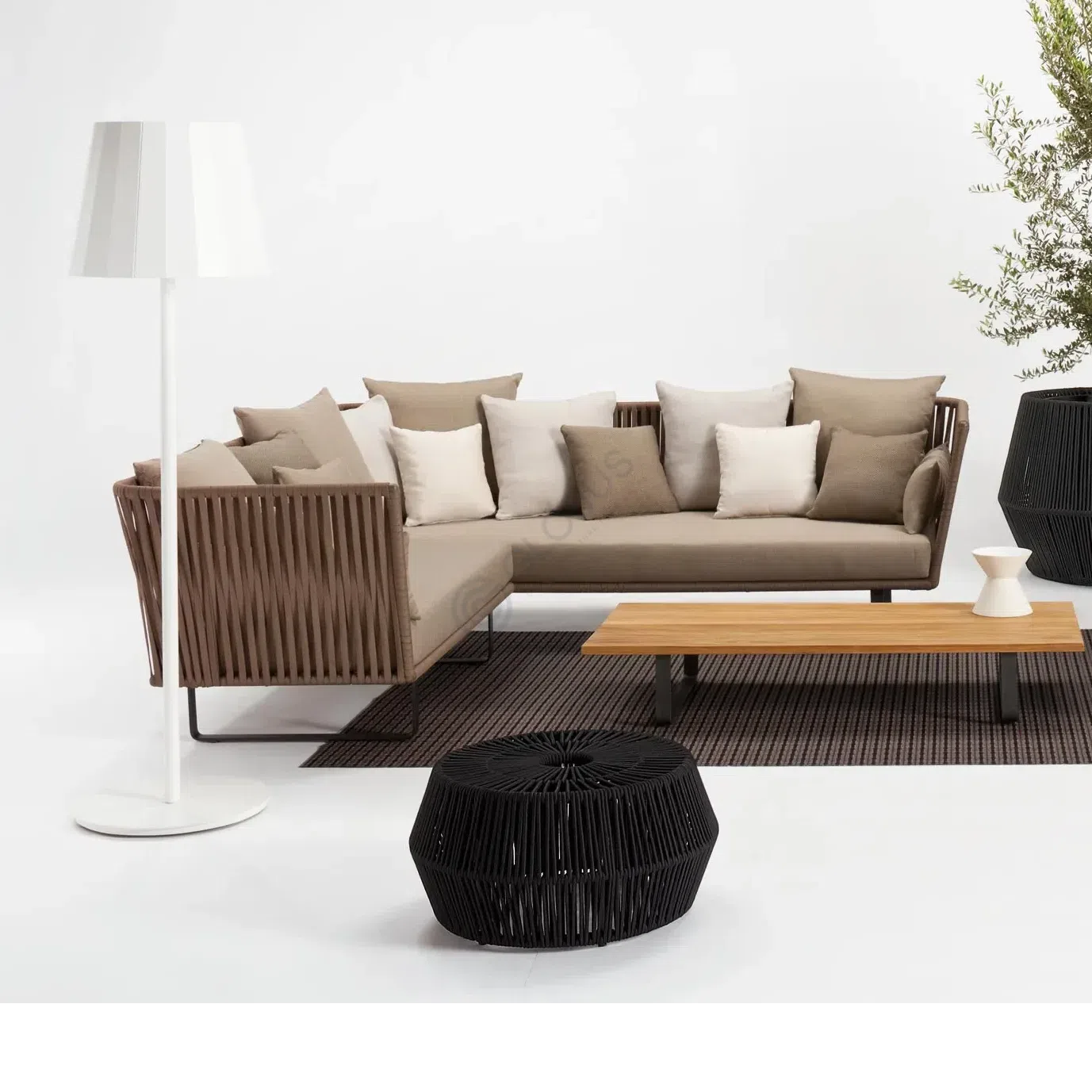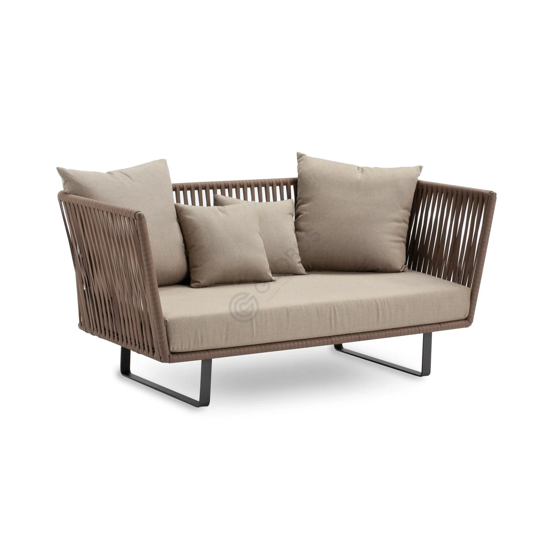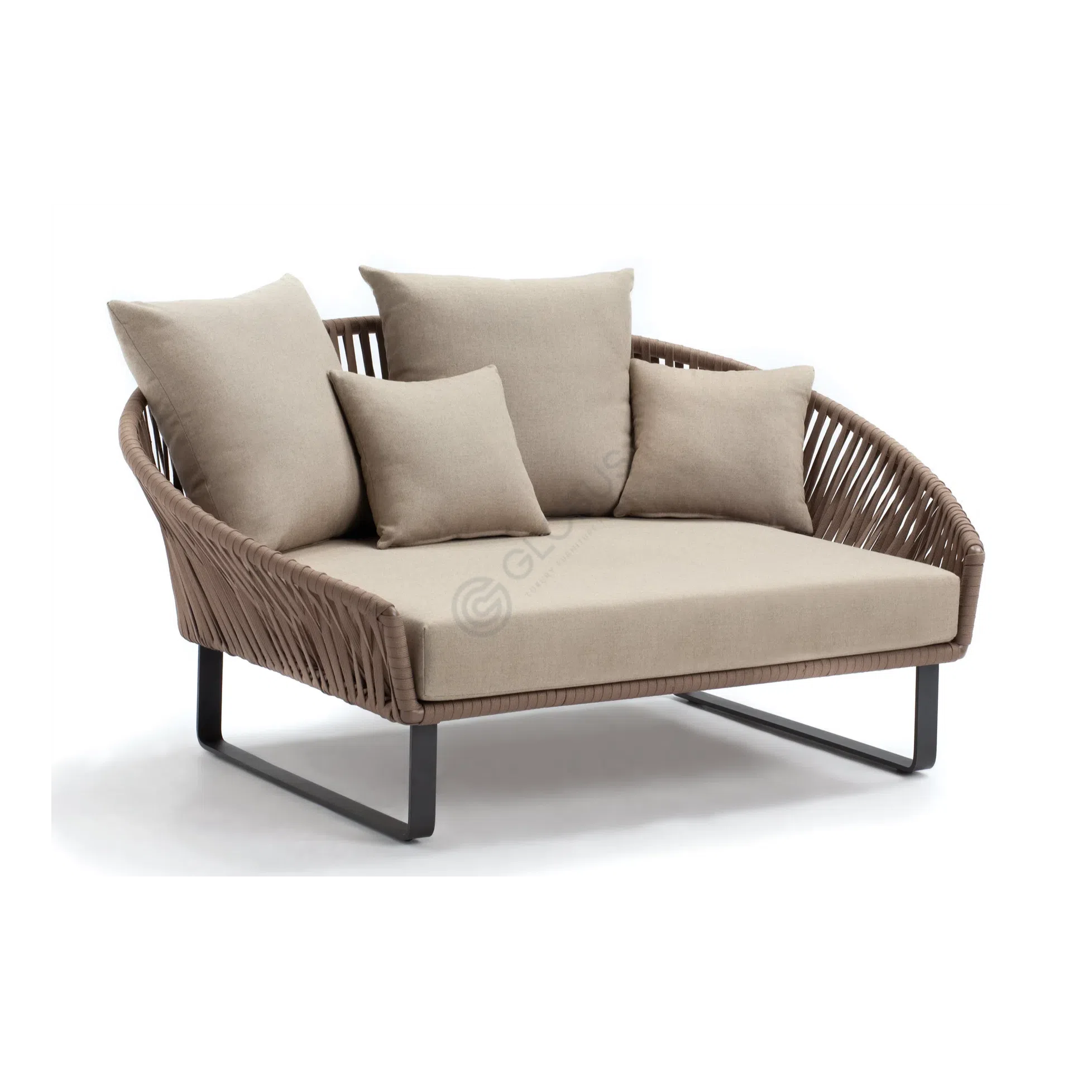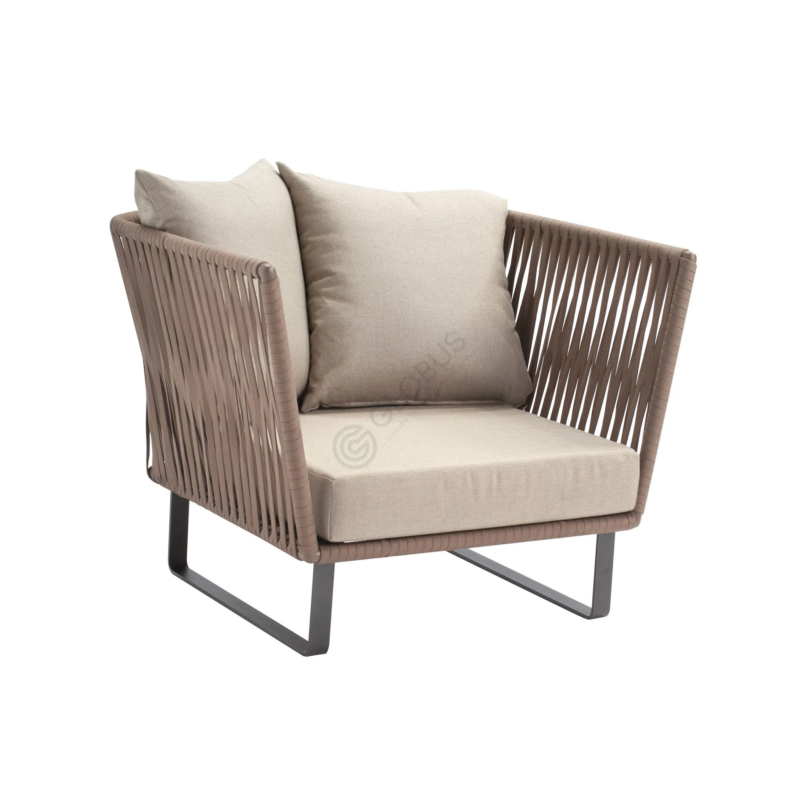 Прочный каркас изделия выполнен из легкого алюминия, что гарантирует надежность и долговечность. Элегантное плетение из особой верёвки придает текстурный шарм и утонченный вид. Мягкие подушки, обтянутые высококачественным текстилем, обеспечивают непревзойденный комфорт, приглашая расслабиться и забыть о повседневности.