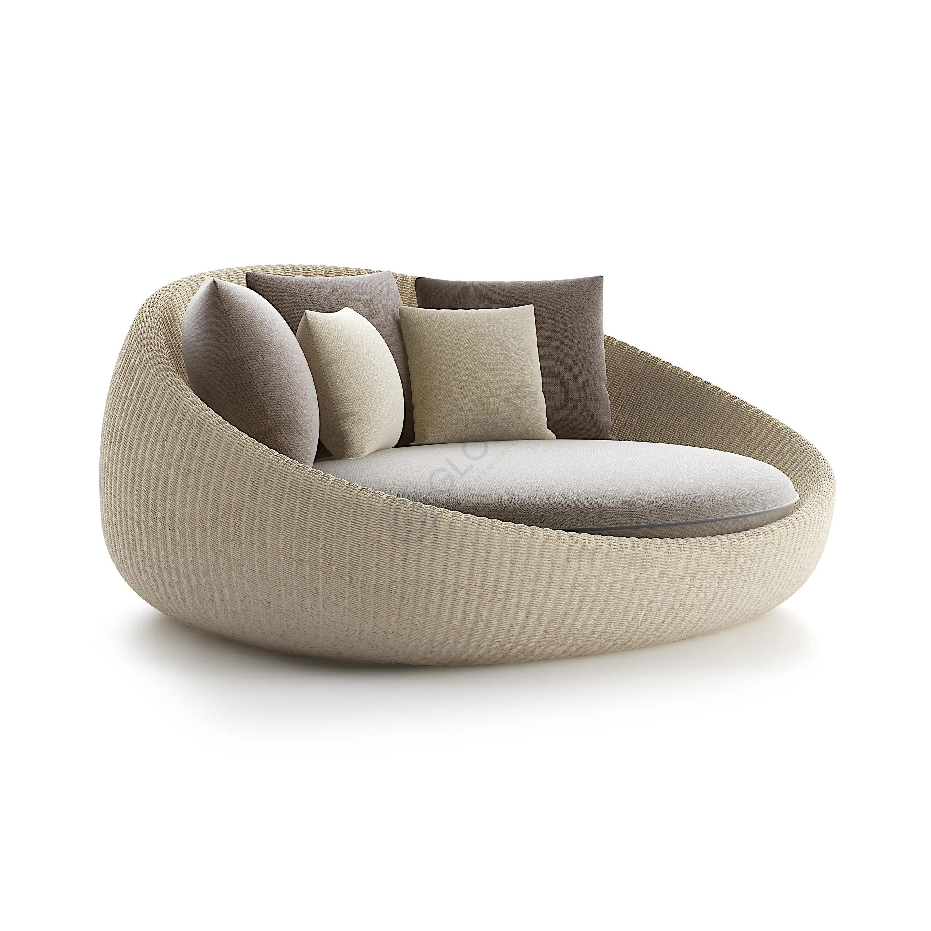 Мягкое сиденье и уютные подушки, обтянутые приятным на ощупь текстилем, гарантируют исключительный комфорт для долгих часов отдыха. Этот элемент интерьера идеально подходит для обустройства зоны у бассейна, террасы или живописного уголка в саду, предлагая совершенное место для расслабления на свежем воздухе.