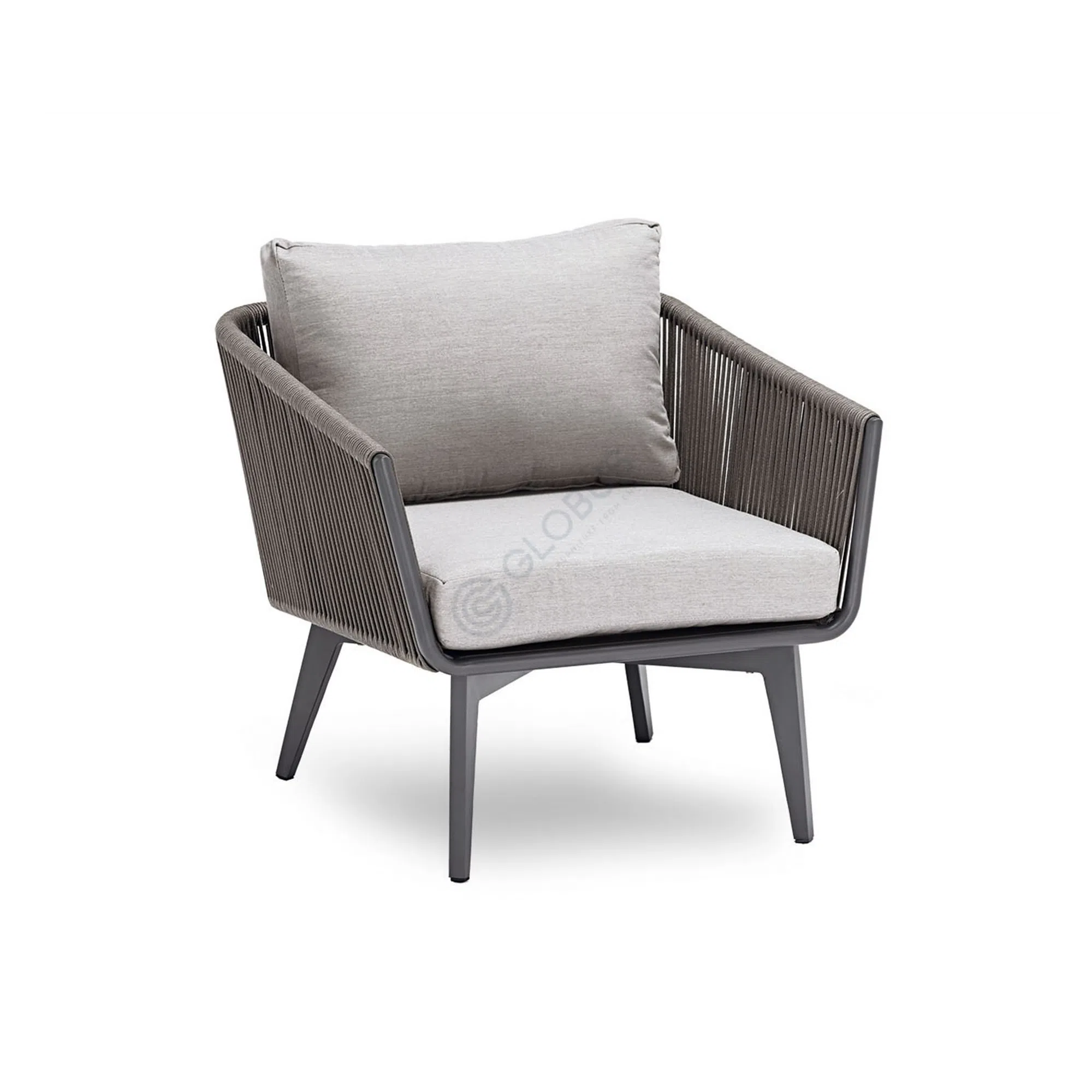 Каркас изделия выполнен из прочного алюминия, обеспечивающего надежность и устойчивость к внешним условиям. Сиденье и спинка образованы сложным плетением из высококачественной веревки, которое придает ему уникальный текстурный вид и обеспечивает вентиляцию. Дополняет композицию мягкая подушка, обтянутая износостойким текстилем, специально подобранным для использования на улице.