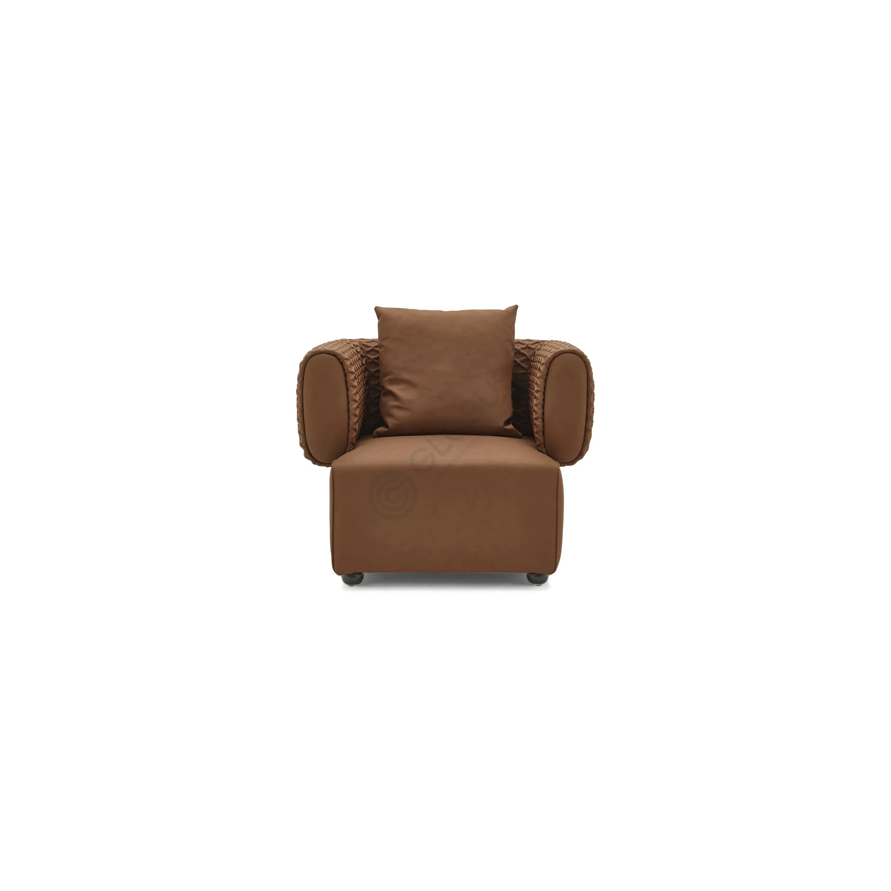 Основа конструкции выполнена с использованием натурального дерева и прочной фанеры, обеспечивая надежность и долговечность каркаса. Уникальное сиденье обтянуто качественным текстилем с выразительной рельефной текстурой, добавляя тактильной привлекательности и визуального интереса. Опоры из нержавеющей стали с элегантным блеском служат устойчивой поддержкой, придают изделию легкость и современный акцент в его дизайне.