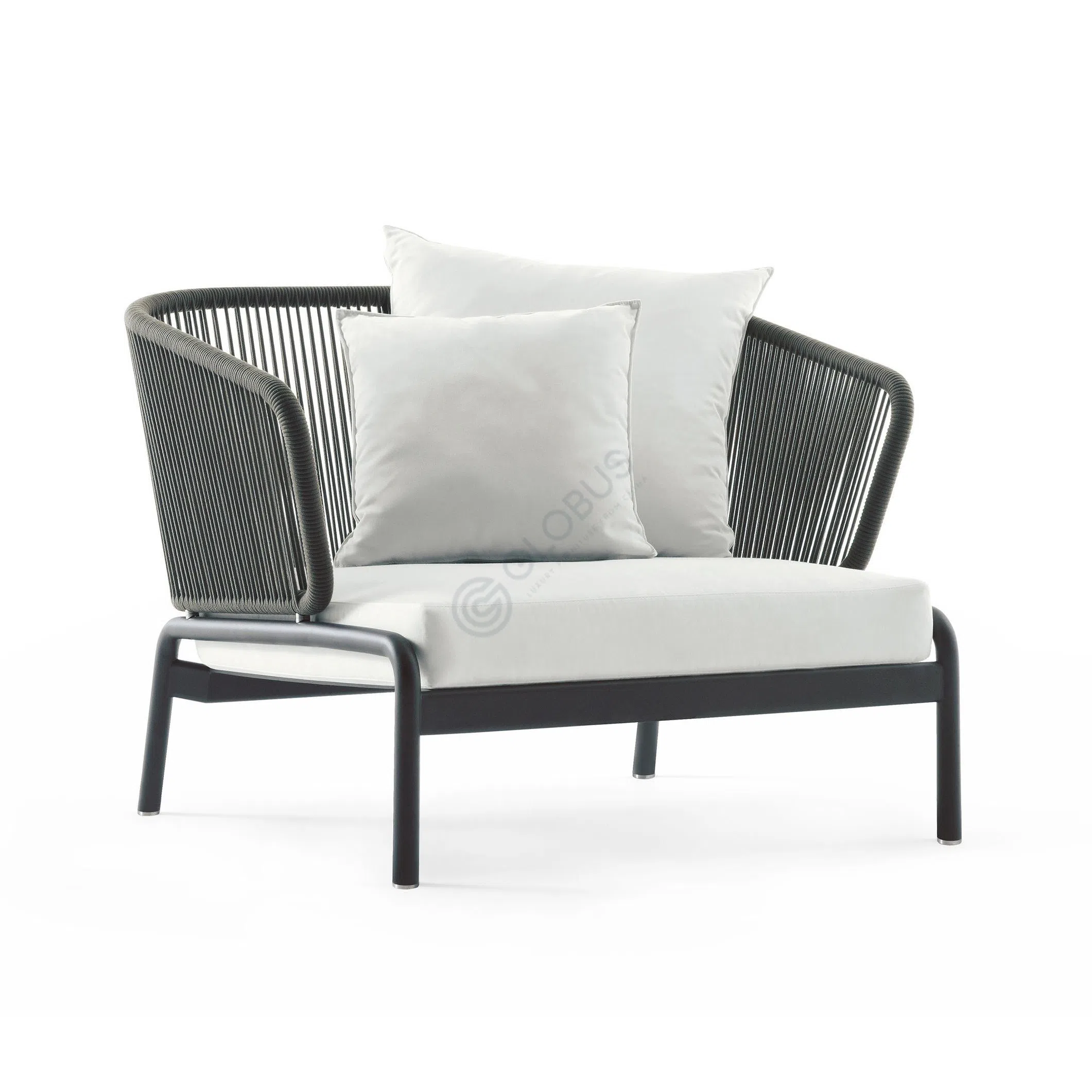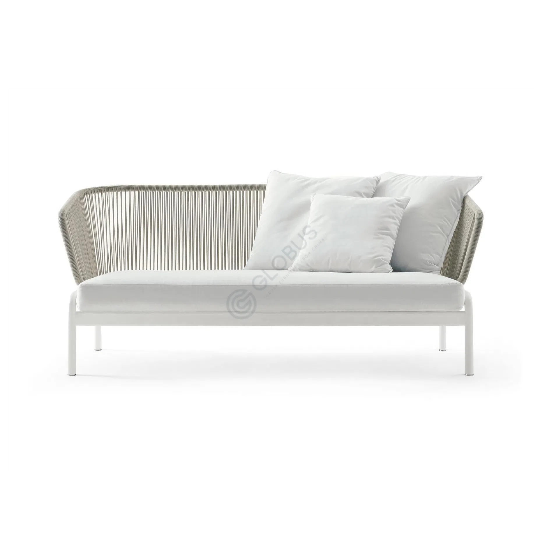 Основой конструкции служит прочный алюминиевый каркас, обеспечивающий стабильность и долговечность. Подлокотник и спинка искусно выполнены из плотного плетения, добавляющего текстурную выразительность и визуальную легкость. Мягкое сиденье и подушки обтянуты высококачественным текстилем, приятным на ощупь и устойчивым к условиям окружающей среды.