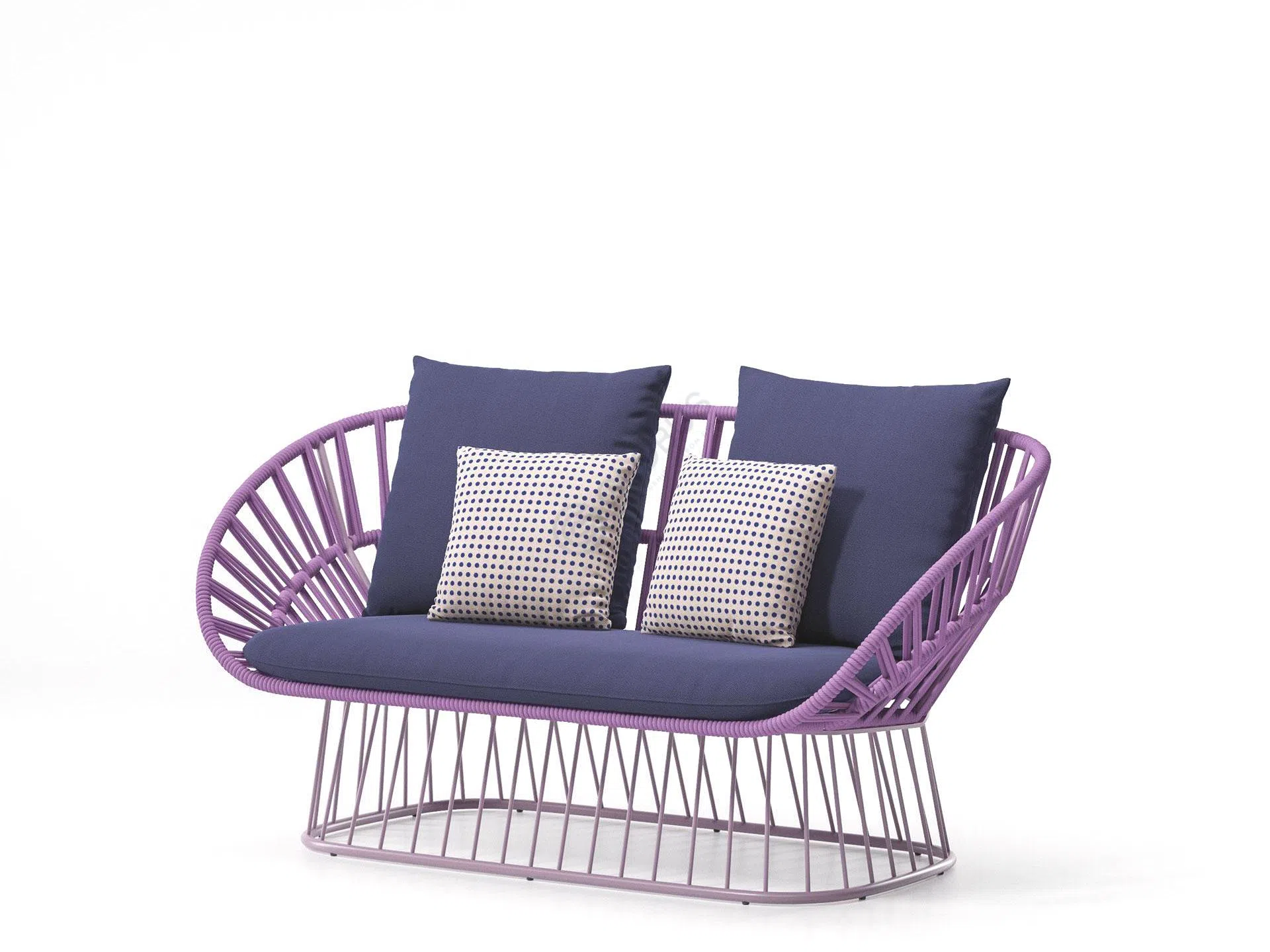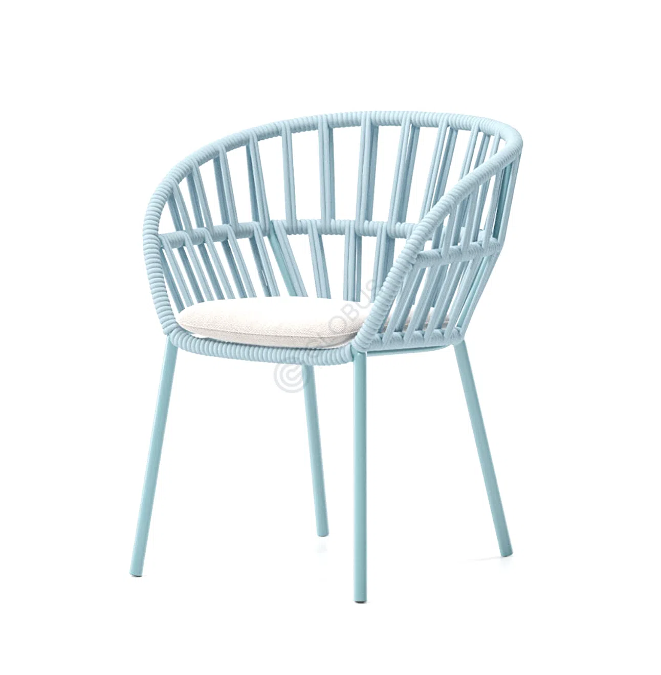 Конструкция сочетает в себе прочность и изящество. Каркас выполнен из долговечного алюминия, обеспечивающего стабильность и устойчивость к внешним условиям. Сиденье и спинка оплетены специальной веревкой, которая придает изделию выразительную текстуру и воздушность. Комфорт обеспечивает комплект мягких подушек из качественного текстиля, идеально дополняющих облик.