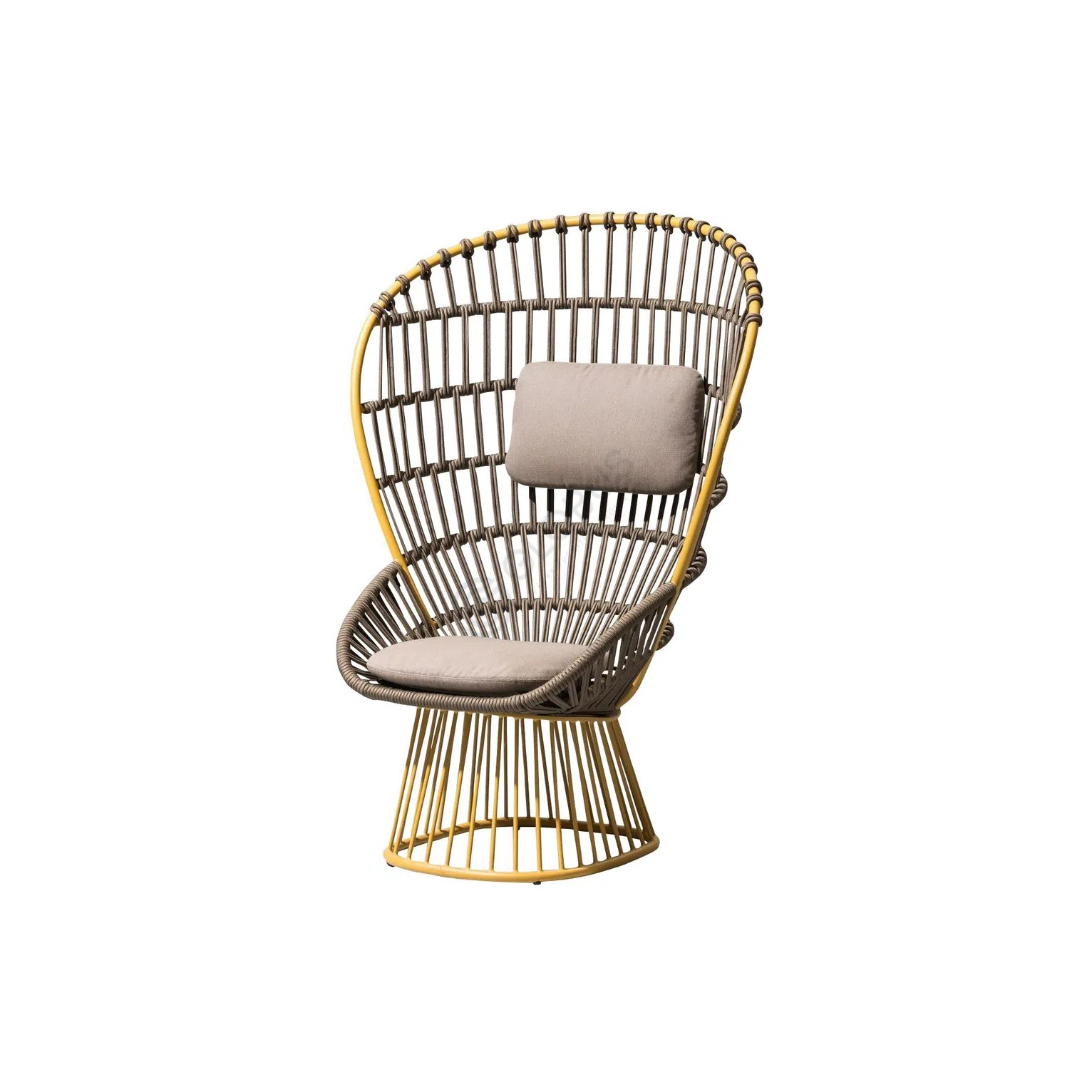 Основание изготовлено из натурального дерева, придающего конструкции теплоту и устойчивость. Сиденье сформировано из прочного верёвочного плетения, создающего уникальную текстуру и обеспечивающего циркуляцию воздуха. Мягкая текстильная подушка дополняет ощущение уюта. В основе скрыт надежный алюминиевый каркас, гарантирующий долговечность изделия и его устойчивость к внешним воздействиям.