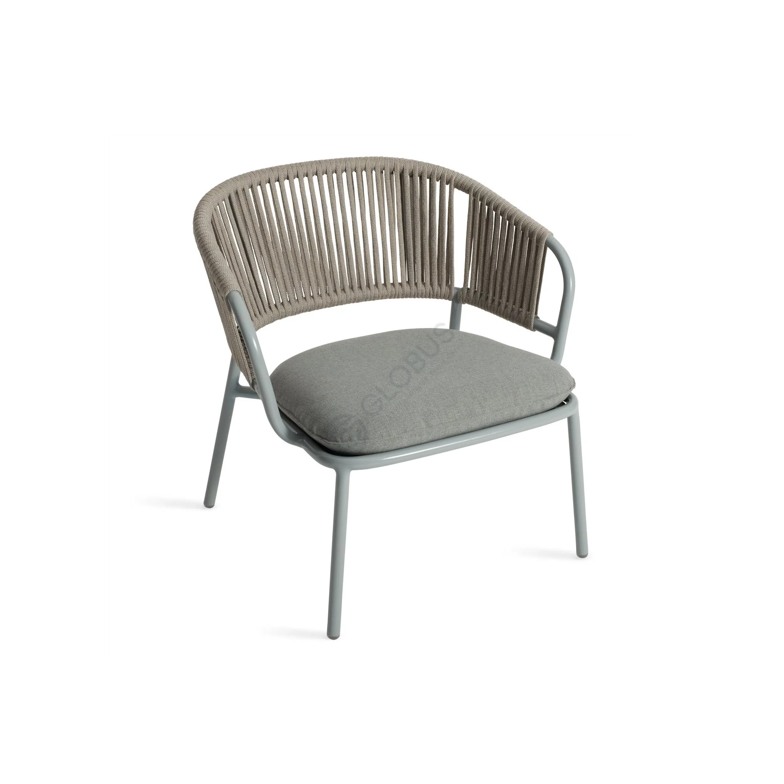 Мастерское сочетание материалов определяет его исключительность. Прочный каркас выполнен из алюминия, обеспечивая надежность и долговечность. Искусное плетение из веревки вручную создает выразительную фактуру спинки и подлокотников, добавляя тактильной привлекательности. Мягкое сиденье из качественного текстиля гарантирует комфорт. Их сочетание подобрано с учетом эксплуатации на открытом воздухе, будь то сад, уютная терраса или зона у бассейна.
