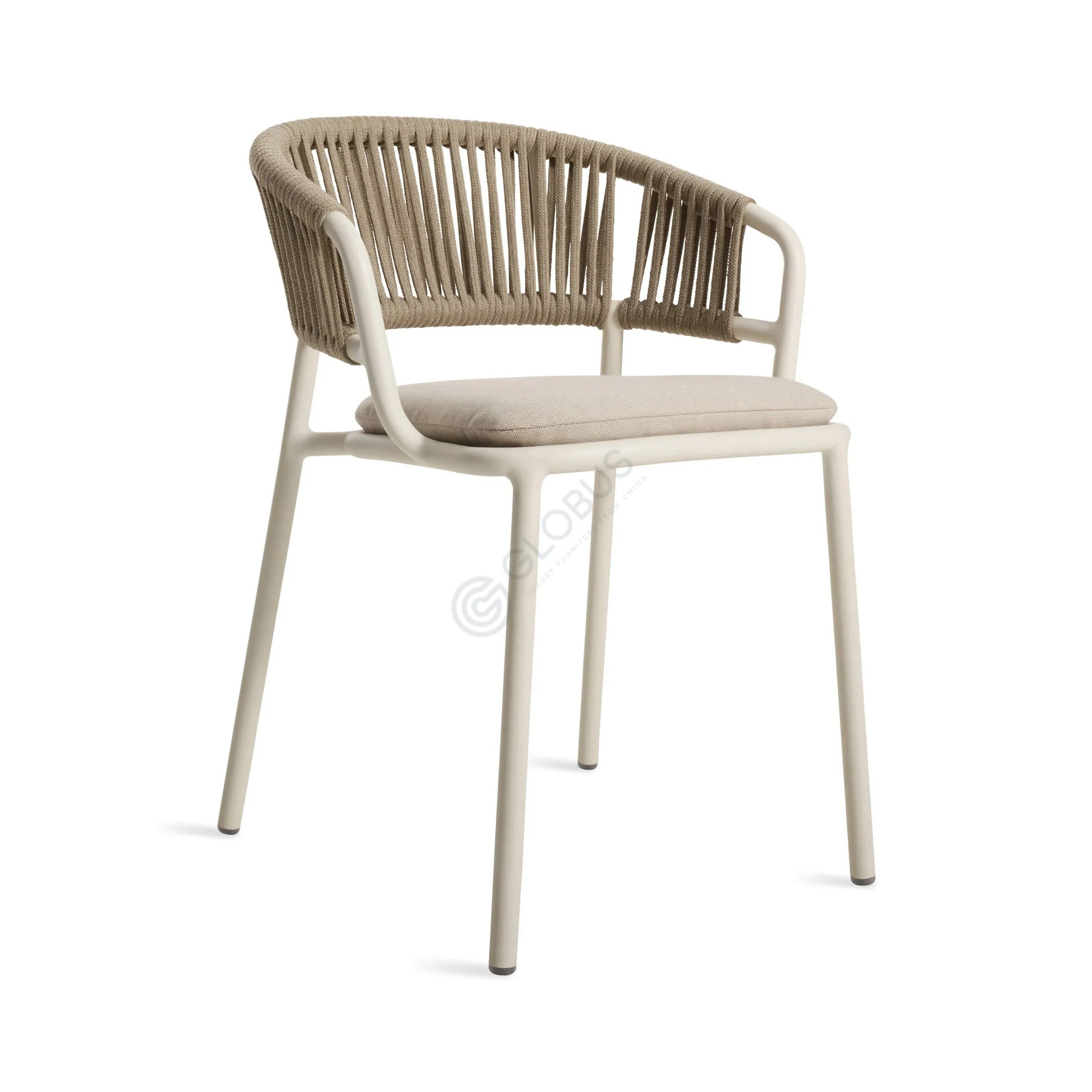 Основа конструкции выполнена из прочного алюминия, гарантирующего устойчивость к атмосферным воздействиям и простоту перемещения. Сиденье и спинка кресла изящно сплетены из специальной веревки, что придает изделию уникальную текстуру и воздушность внешнего вида. Мягкие подушки, обтянутые высококачественным текстилем, обеспечивают непревзойденный уровень удобства, приглашая полностью расслабиться.