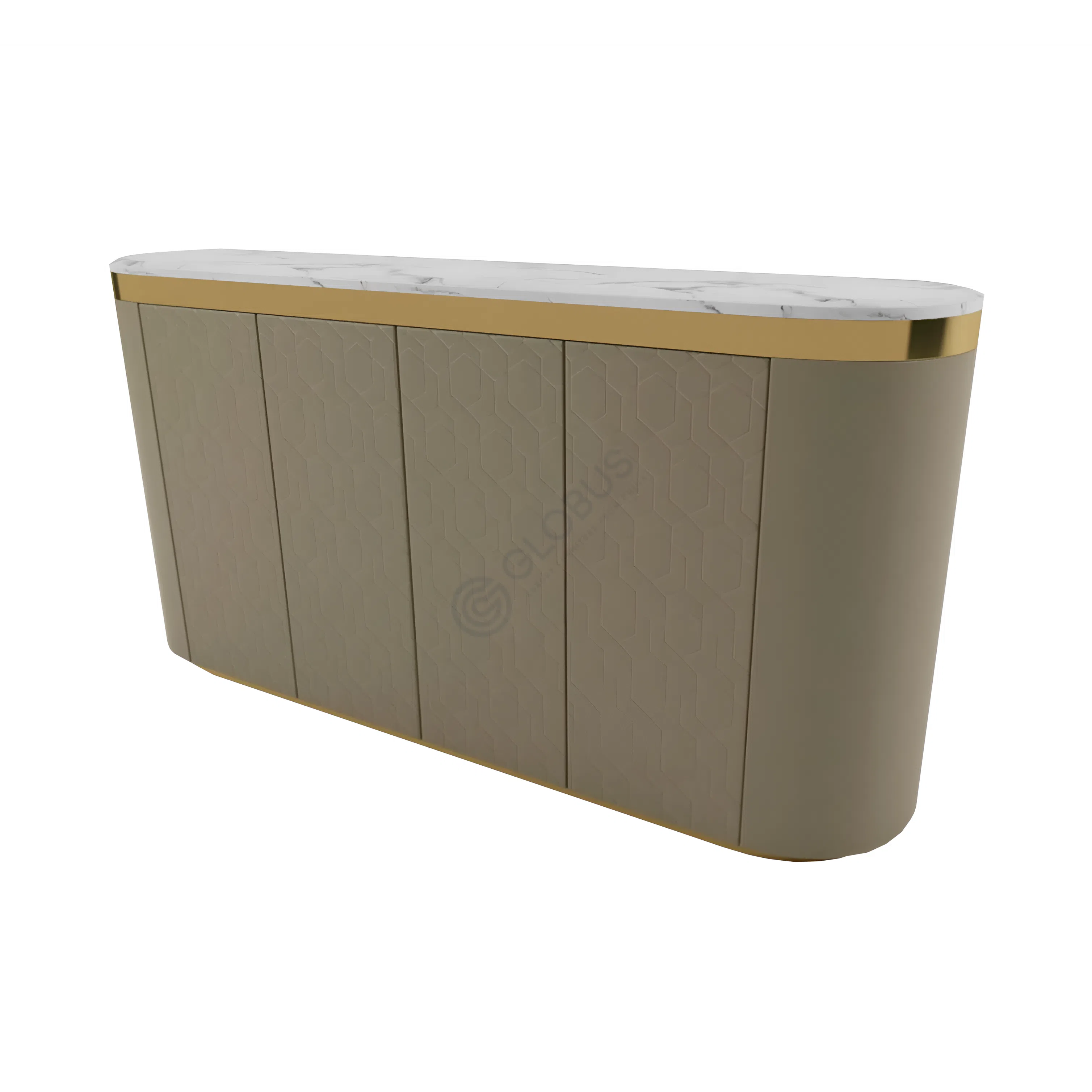 Верхняя часть, выполненная из высококачественного искусственного мрамора, привлекает внимание своей богатой текстурой и глубоким узором. Его слегка скругленные края и благородный оттенок наделяют столешницу особой мягкостью. Тонкий кант из сияющей нержавеющей стали золотистого цвета деликатно обрамляет мраморную плоскость, добавляя элементу шика и блеска.