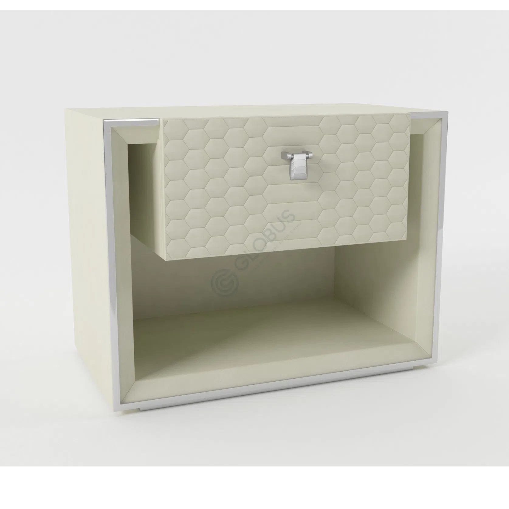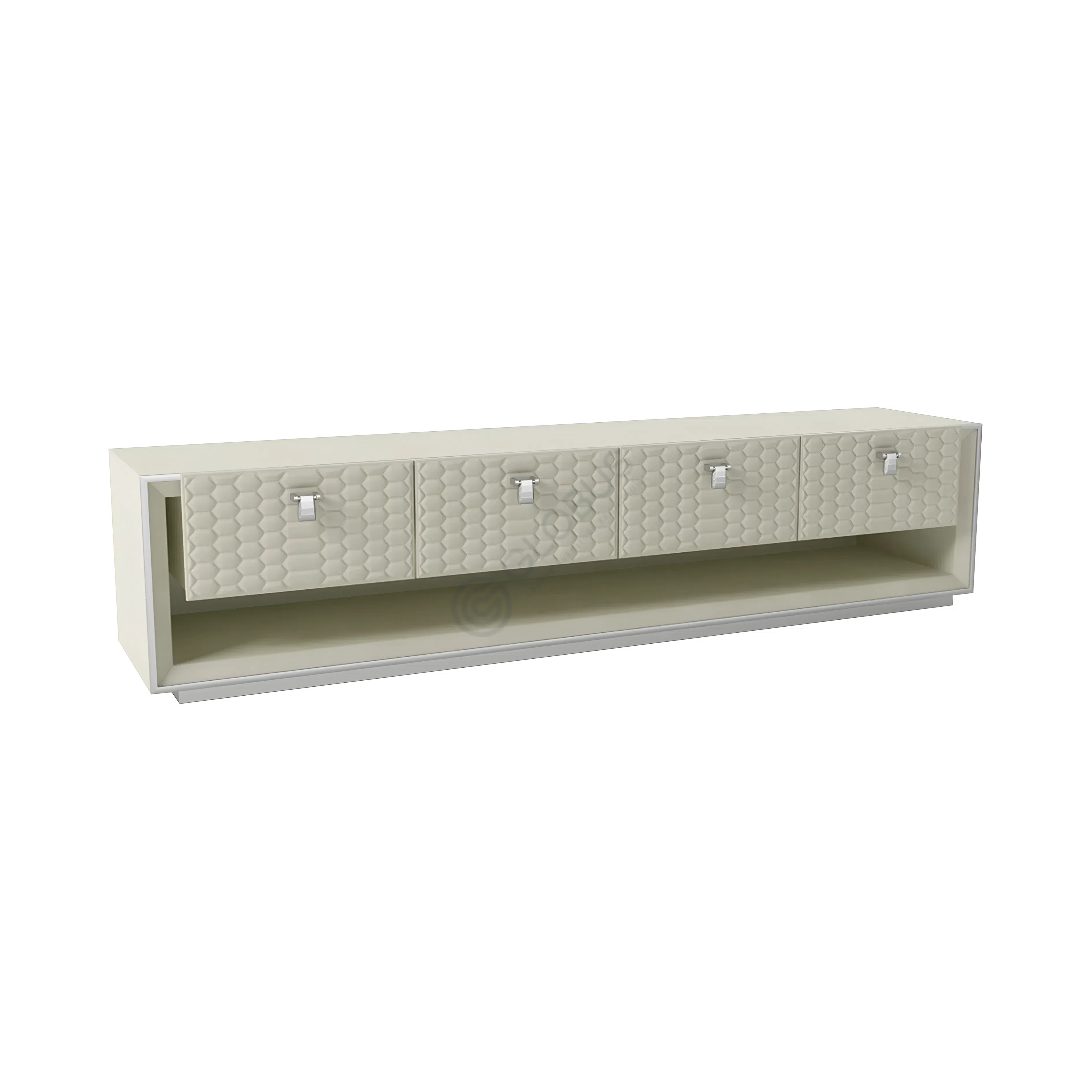 Фасад каждой из четырех выдвижных секций обит нежнейшей экокожей на микрофибре, создавая деликатный объемный узор, который приглашает к тактильному взаимодействию. Этот материал не только приятен на ощупь, но и практичен в использовании, добавляя изделию роскоши и мягкости. Основа конструкции, выполненная из высококачественной фанеры, обеспечивает прочность и долговечность, а изящные элементы из нержавеющей стали тонко подчеркивают современный характер предмета.